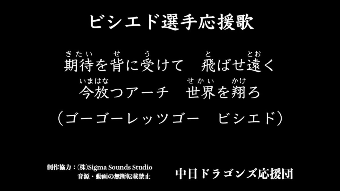 【歌詞】 期待を背に受けて 飛ばせ遠く 今放つアーチ 世界を翔ろ (ゴーゴーレッツゴー ビシエド) <新規団員絶賛募集中!> 中日ドラゴンズ応援団 公式サイト https://chunichiouendan.wixsite.com/dragonsouendan ※動画、画像、音源等を、権利者の許可無く複製、転用、販売などの二次利用することを固く禁じます。 【制作協力】(株) Sigma Sounds Studio 【監修】中日ドラゴンズ応援団 Chunichi Dragonsビシエド 野球中日ドラゴンズ NPBHUB.COM | The Fanbase of Nippon Baseball & Nippon Professional Baseball