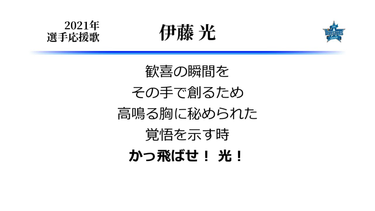 DeNA伊藤光選手の応援歌です。 今年セの一部球団で流行の2番捕手打線、といっても伊藤光以外はヤクルトだけですが、 2番中村悠平はまあ理解できるものの、2番古賀はちょっと冒険しすぎでは。 ○伊藤応援歌(オリックス時代)→https://youtu.be/Snus5NuyRcU Hikaru Itoh (Baseball Player)YOKOHAMA DeNA BAYSTARSYokohama DeNA BayStars (Baseball Team)なんぶふじ伊藤光応援歌横浜DeNAベイスターズ NPBHUB.COM | The Fanbase of Nippon Baseball & Nippon Professional Baseball