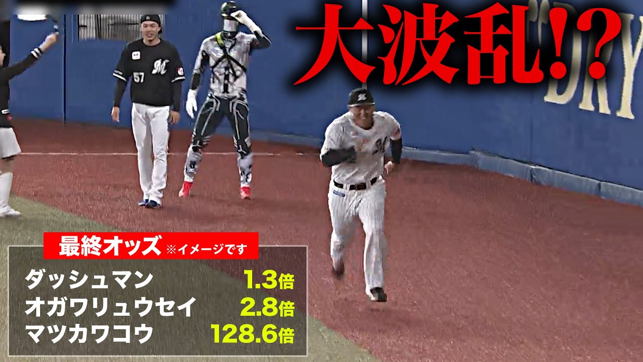 ZOZOマリンスタジアムで行われている「MARINES FAN FEST 2023」。第二部の白黒野球対決が行われ、2裏終了時に「DASHMAN」vsマリーンズ選手の夢対決が実現した。まずは松川虎生がスタートし、任意の範囲をつけたのち、小川龍成がスタート。さらにDASHMANがスタートするという流れ。いざスタートが切られると、松川虎生がまさかの大逃げ。グングングングン差を開く!! グングングングン差を開く!! このまま行ったら大波乱になるぞ、このまま行ったら大波乱になるぞ。スピードは衰えることなく、まるでアドマイヤベルナの三木特別のような大逃げを打った松川虎生。番手の小川龍成、ダッシュマンがラトルスネークの新馬戦のような鬼脚で猛追するも及ばず。松川虎生が大西直宏氏のようなお見事なペース配分で逃げ切ってみせた!!