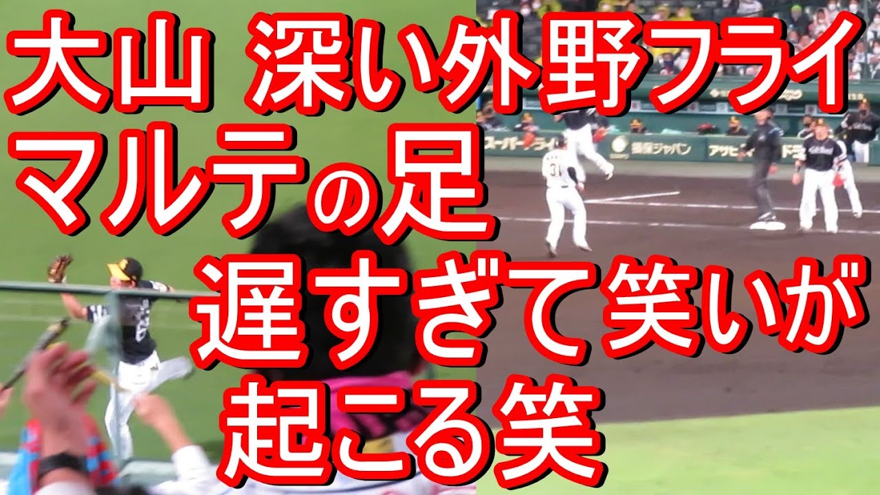 大山悠輔のあわや長打の当たりをセンターがキャッチ。マルテが2塁からタッチアップ。悠々セーフのはずだが、マルテの足が遅すぎて「なんか危ない!」「大丈夫か?」みたいになり、ライトスタンドに笑いが起こりました!笑