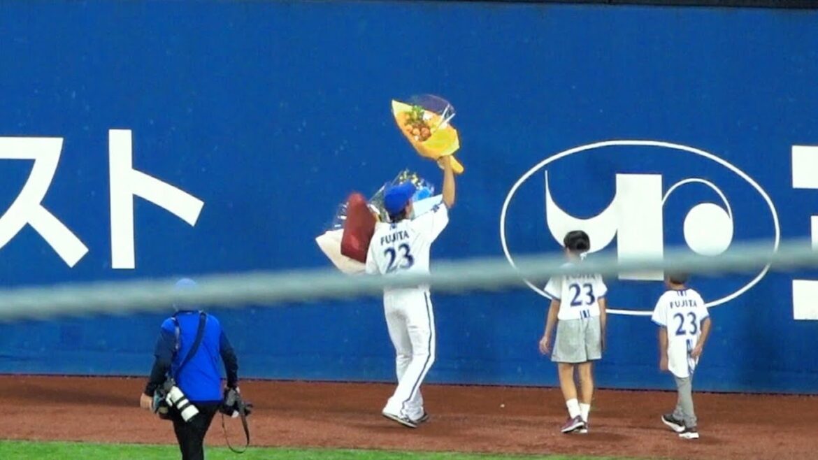 ライトスタンドからの花束を受け取る藤田一也!引退セレモニーの場内一周!2023/09/27 横浜DeNAベイスターズ