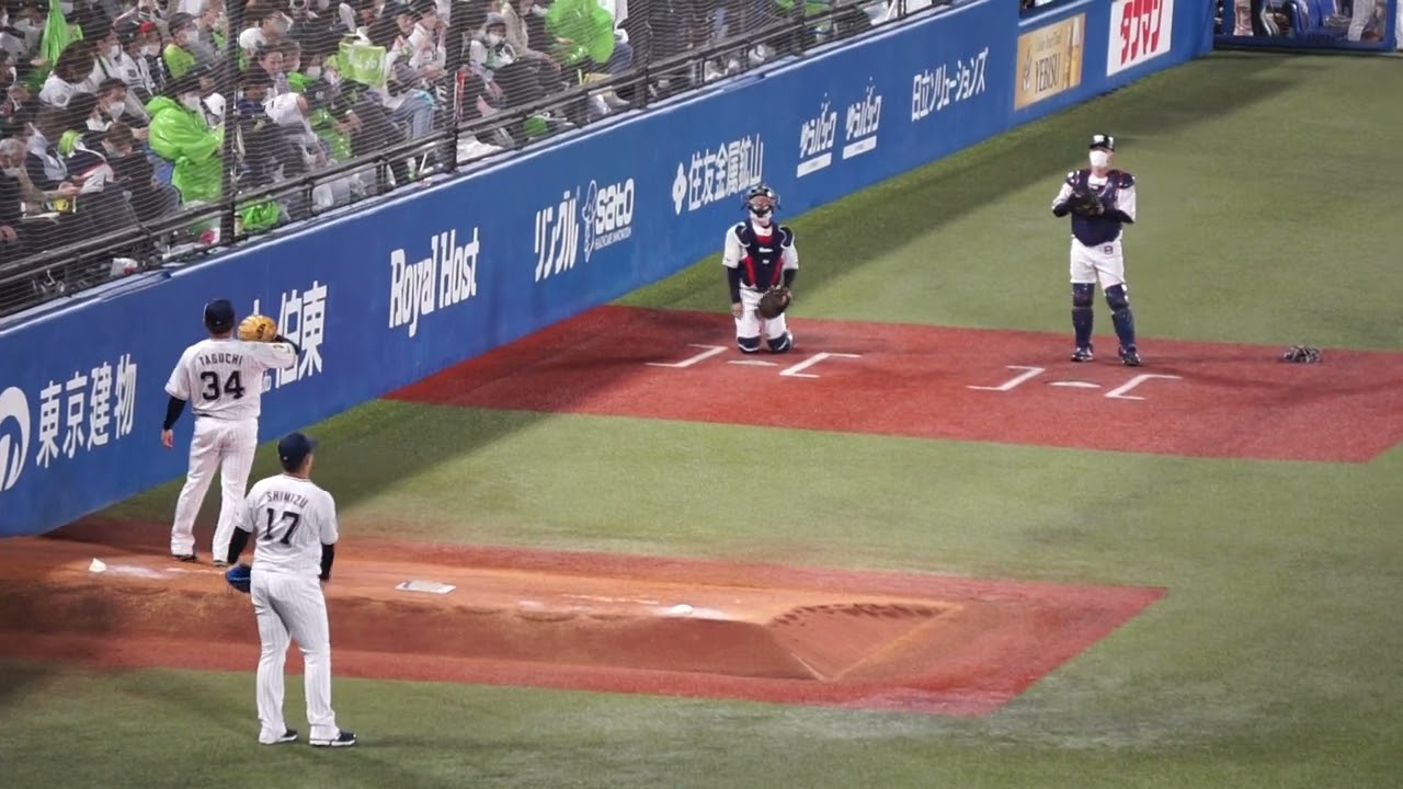 8回表 清水昇投手、田口麗斗投手がブルペンで投球練習を始める。