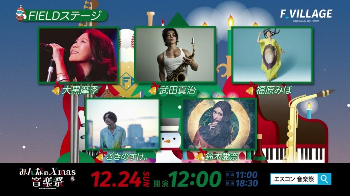 クリスマスイブの日に、エスコンフィールドHOKKAIDOの様々な場所で音楽が響き渡る。プロのアーティストから小学生、高校生まで様々な音楽を楽しむ「みんなのXmas音楽祭」を、12月24日(日)に開催いたします。イベントの最後にはクリスマスソングを皆様で合唱し、Fビレッジの夜空にXmas色に彩られた花火、約1000発が打ち上がります。