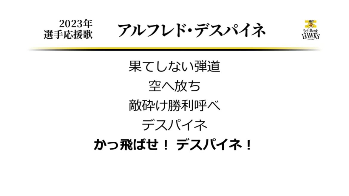 ソフトバンクデスパイネの応援歌です。 背番号25は個人的にも違和感がありますが、 2023年選手応援歌の動画として作った手前、御容赦ください。 ○デスパイネ応援歌(ロッテ時代)→https://youtu.be/fH8z-GL0cYs Alfredo Despaigne (Baseball Player)Fukuoka SoftBank HawksFukuoka SoftBank Hawks (Baseball Team)アルフレド・デスパイネデスパイネ 野球なんぶふじ応援歌福岡ソフトバンクホークス NPBHUB.COM | The Fanbase of Nippon Baseball & Nippon Professional Baseball