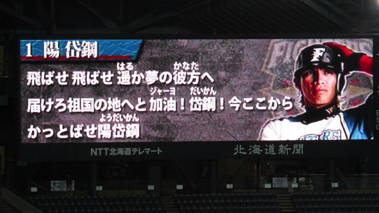 飛ばせ飛ばせ 遥か夢の彼方へ 届けろ祖国の地へと 加油(ジャーヨ)! 岱鋼!今ここから 2014Dai-Kang YangHokkaido Nippon-Ham Fighters (Baseball Team)Yomiuri Giants北海道日本ハムファイターズ応援歌日本ハムファイターズ読売ジャイアンツ陽岱鋼 NPBHUB.COM | The Fanbase of Nippon Baseball & Nippon Professional Baseball