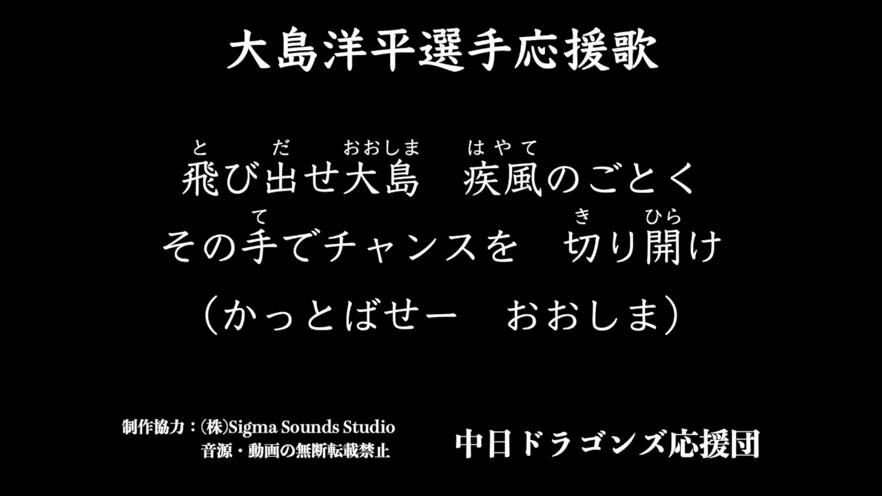 【歌詞】 飛び出せ大島 疾風のごとく その手でチャンスを 切り開け (かっとばせー おおしま) <新規団員絶賛募集中!> 中日ドラゴンズ応援団 公式サイト https://chunichiouendan.wixsite.com/dragonsouendan ※動画、画像、音源等を、権利者の許可無く複製、転用、販売などの二次利用することを固く禁じます。 【制作協力】(株) Sigma Sounds Studio 【監修】中日ドラゴンズ応援団 Chunichi Dragons中日ドラゴンズ大島洋平 NPBHUB.COM | The Fanbase of Nippon Baseball & Nippon Professional Baseball