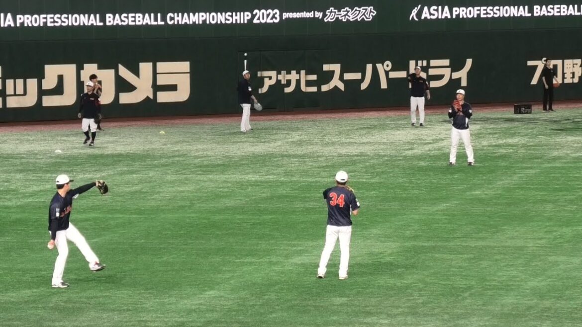 侍ジャパン 吉村貢司郎(ヤ)・清水達也(中) キャッチボール の様子。と田口と桐敷~2023.11.18