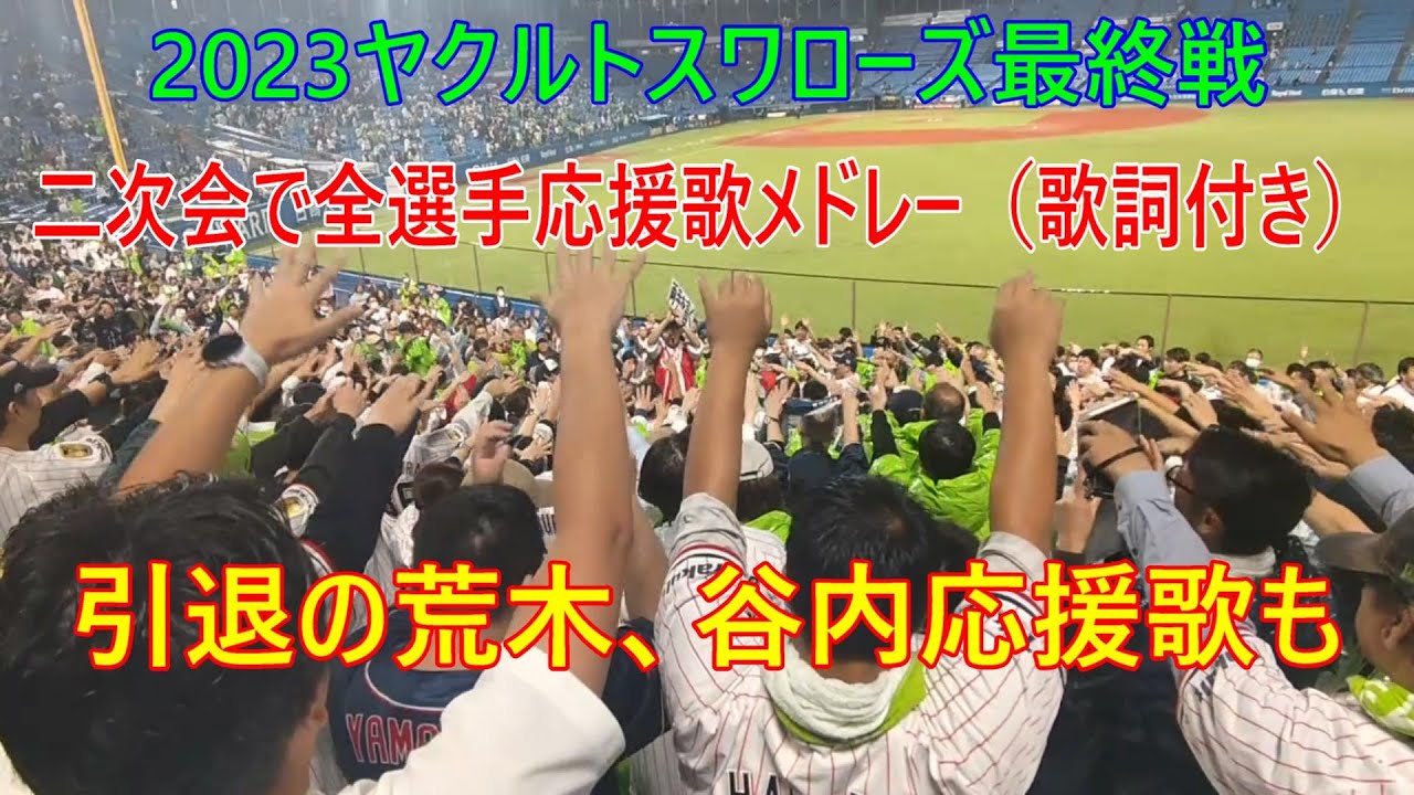 ヤクルトスワローズ2023最終戦 勝利後の二次会で全選手応援歌メドレー(元ヤクルト、引退の谷内亮太もあり)歌詞付き 東京ヤクルトスワローズVS阪神タイガース 明治神宮野球場 2023.10.4
