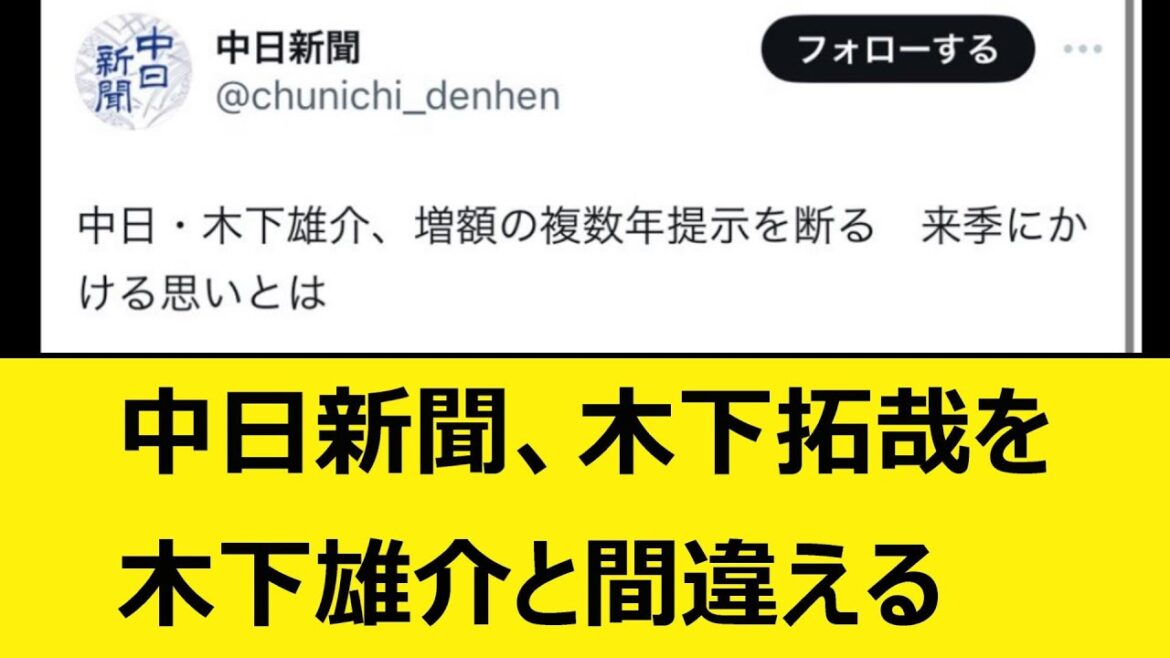中日新聞、木下拓哉を木下雄介と間違える【なんJ、なんG反応】【2ch、5chまとめ】【プロ野球、中日ドラゴンズ、立浪監督、チュニドラ】