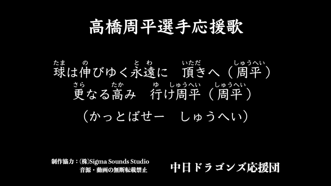 【歌詞】 球は伸びゆく永遠に 頂きへ(周平) 更なる高み 行け周平(周平) (かっとばせー しゅうへい) <新規団員絶賛募集中!> 中日ドラゴンズ応援団 公式サイト https://chunichiouendan.wixsite.com/dragonsouendan ※動画、画像、音源等を、権利者の許可無く複製、転用、販売などの二次利用することを固く禁じます。 【制作協力】(株) Sigma Sounds Studio 【監修】中日ドラゴンズ応援団 Chunichi Dragons中日ドラゴンズ高橋周平 NPBHUB.COM | The Fanbase of Nippon Baseball & Nippon Professional Baseball