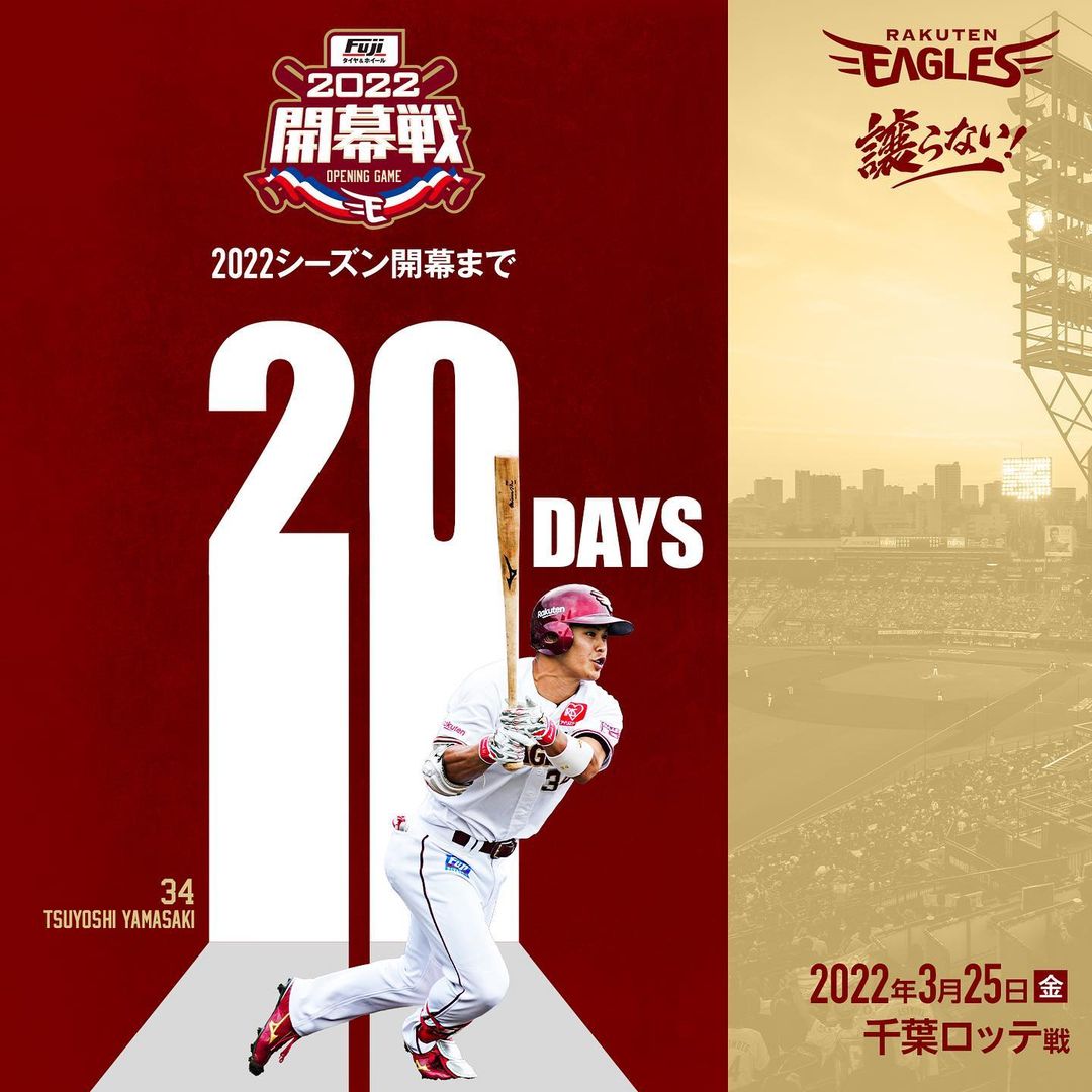 . 2022シーズン開幕まで…20日 #rakuteneagles #譲らない #東北開幕 #山﨑剛 NPB Pacific LeagueOfficial MediaTohoku Rakuten Golden Eagles Official Media NPBHUB.COM | The Fanbase of Nippon Baseball & Nippon Professional Baseball
