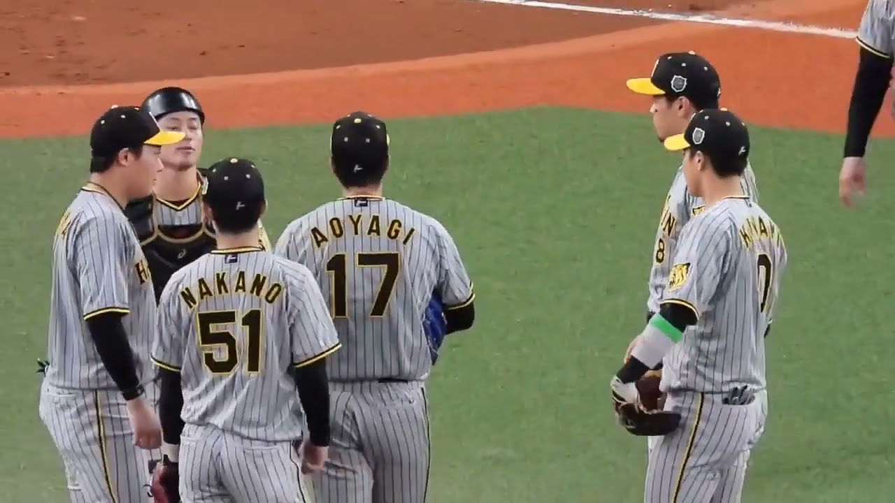 【ベンチで号泣が止まらない】日本一の座を争う大事な一戦、青柳晃洋が先発投手として大活躍! 試合が終わると、彼は身を乗り出してチームメイトを全力でサポートする。