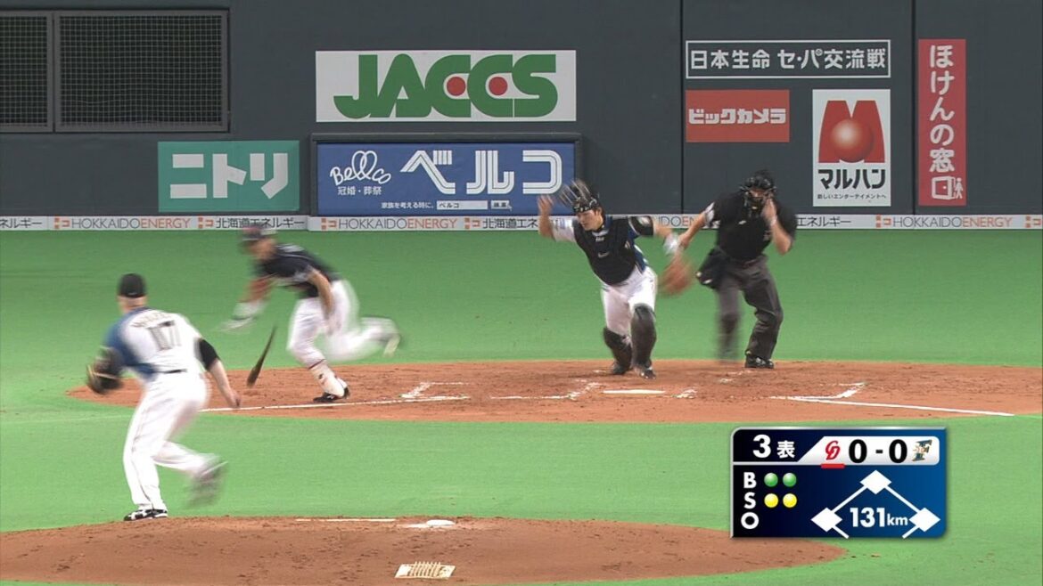 3回、中日・大島が何とかバットに当てた打球を日本ハム大野がダッシュで追いつき落ち着いて一塁へ送球。処理の難しい打球だったが、これでしかアウトに出来ないというプレーを見せた。 (5月26日 日本ハム-中日)