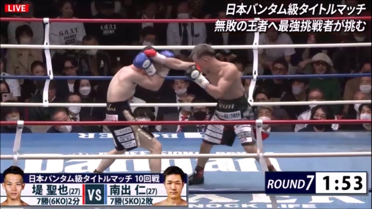 日本バンタム級タイトルマッチ10回戦 王者 堤聖也(角海老宝石) vs 同級1位 南出仁(セレス) ダウン&決着シーン
