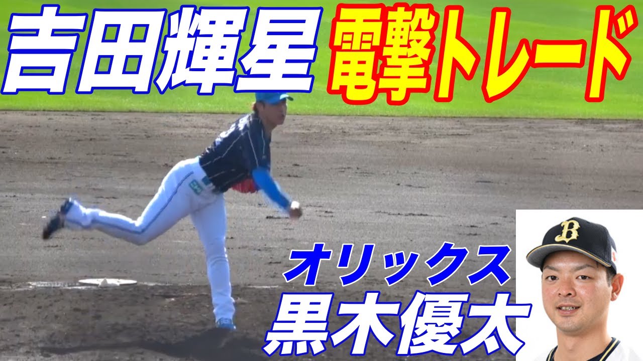日本ハム吉田厚生投手とオリックス黒木 優太投手のトレードが24日両球団から 発表され た吉田は日本ハム球団を通じドラフト1位 でファイターズに獲得してもらって5年間 優勝に貢献するような活躍ができず申し訳 ないですしすごく悔しいですたくさんの 方々に支えられて感謝しかありません ファンの皆さん応援していただいて ありがとうござい 黒は突然のことで驚きましたが必要とされ た環境でプレイできるということは野球人 として嬉しいことだと思いますので今は 素直に受け止めて天地で頑張ろうという 気持ちになってい ます吉田は18年にドラフト1位で日本 ハムに断4年目の 主にとして51試合と は先試合 でし21日にから4万円の1600万円で 契約を公開したばかりだっ た黒は立から16年ドラフト2位で オリックス入団1年目に55試合に投げた が右肘の障に苦しんだ今期は12試合に 登板した今期年は 3000万円 [拍手] 先線にお気をつけ くださいファールボールにご注意 ください はいライト [拍手] 恵 [拍手] [音楽] はい ト
