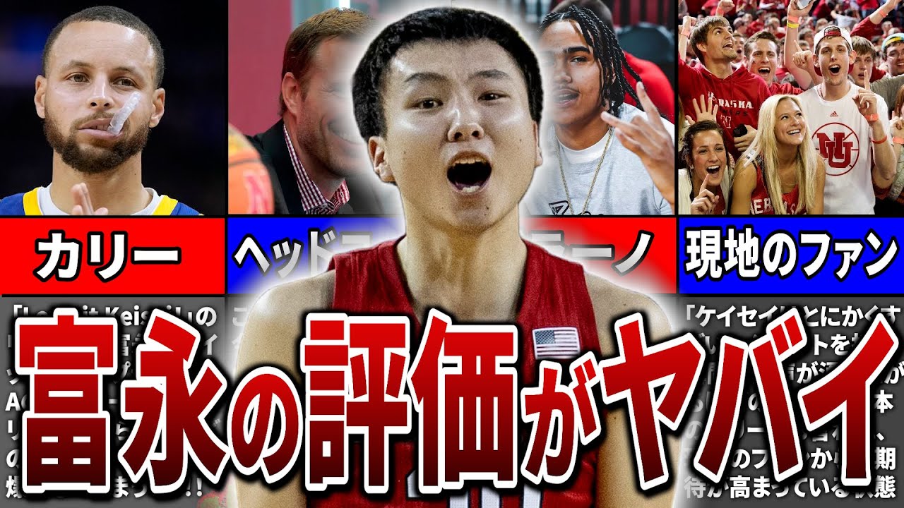 和製カリーとも称され今日本人で最も NBAに近いと言われている富永現在は ネブラスカ大学で活躍を見せています今回 はそんな富永が躍進していく上で彼に寄せ られた海外からのリアルな評価8個ほど まとめてきました プレイ集なども交えながら紹介していき ますのでお楽しみください 富永が現地のリアルな声を聞くことは滅多 にないと思うので1つ目の評価はプレイ 映像なども交えながら紹介していきます 最初に紹介するのはレンジャー大学時代 です2021年3月の3日に行われた グレイソンカレッジとの一戦結果からお 伝えすると 冨永はこの試合で39得点をマークして おりフィールドゴールは18本中16本と 驚異的な確率でシュートを決めていました 90%ほどの確率で富永のシュート精度は 本当に素晴らしいですよねまたこの試合で 富永は3ポイントも量産しており実際に 富永がコーナーから3ポイントを決めた 場面では海上中からとんでもない歓声が 上がります これだけの完成が上がるなんて 富永のプレイがいかに神がかっていてまた 速攻の場面で3ポイントを決めた際にも 会場中が大盛り上がり富永がチームメイト たちに 盛大に迎え入れられるシーンがカメラに 映し出されていましたまた次の試合でも 富永はスチームハイとなる26得点を記録 し3ポイントは7本中7本となんと 100%の成功率を叩き出したんですこれ だけ3ポイントが入る選手がいたら 敵チームからしたら相当嫌な選手ですよね 特に2月28日からの1週間 富永はとんでもないほどの素晴らしい 成績を残しておりフィールドゴールは35 本中23本成功 率が65.7%を記録続く3ポイントも 30本中18本で 成功率60%ともう化け物級の記録ですよ ねNBAでも50%を超える3ポイント 確率はあまり見ないので60%はもう正直 異次元ですそんな富永の活躍が評価され ニューメキシコ州とテキサス州西部に該当 するビジョンファイブで収監最優秀 選手に選出され現地の記事でデカデカと 富永の写真が張り出されていましたまた 富永は伝家の宝刀である3ポイントが バスケットボールの本場であるアメリカで もしっかりと通用することを証明しました 現にシーズン11試合を終えた時点で成功 率は53.8%と高水準を維持しています