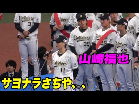 [音楽] [拍手] はい えまずえこの場をえ設けてくださったえ オリンピ球団のえ関係者の皆様え今日は 本当に感謝しますえそしてえこの球場にえ たくさんえ今日はファンフェストに来て いいたファの方々本当にありがとうござい ます え行動方でえ皆さんご存知かもしれません がえ来期 え北海道日パンファイターズさんでえ野球 をさせていただくことになりましたえ本当 にいい時もえ悪い時もえ僕がなかなかえ 成績が出ない時もえファンの方々はえ 温かく見守ってくださり本当に感謝してお ます [拍手] え最後の最後まで悩みましたけどえこの前 のパレードの時だってえ本当に熱い 5000円え いただき本当にえ心がグラグラと揺れてい ましたえ第からはえ動物リーグということ でまたヨスドームでえ投げることがあると 思いますえその時は温かい5000円また 温かくえ見守っていてくださいえそして今 後ろにいるえチームメイトとえ対決できる ことを僕はすごく楽しみにして北海道の地 で頑張ってき [音楽] ますこのにやりました けど本当にえこの急年間えオリスの関係者 の皆様えジはめ中島監督え工事の皆様え 裏方さんえトレーナーの皆様そして チームメイトえ最後にファンの皆様え本当 に9年間ありがとうございまし たありがとうござい まし続いて大方フの皆様へご挨拶おなさい [拍手] [音楽] ます せ
