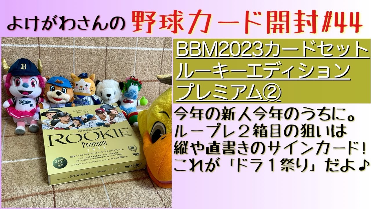 どうも川ですよろしくお願いします野球の カードを開けて ますこの動画が上がっているのがおそらく クリスマス頃かその後くらい予定ではこの チャンネル年内最後の開封動画となります 今年の2月からこうやって野球カード 開ける動画をお届けしておりますけれども 本当に始めた当初思っていたよりも多くの チャンネル登録者数視聴回数多くの リアクションもね色々いだいて1人で細細 とカードを開けるだけではなく野球カード の楽しさをねまYouTubeを通してお 届けできていることを自体が本当に楽しく て皆様のおかげでとりあえず年内は続け られたなと思ってます本当にありがとう ございます感謝しておりますま来年以降も 変わらずカード開封動画の方を上げていく つもりですのでま皆さんの色々見ている カード開封に限らず色々見ている YouTubeの動画のまその中の1つと して今後も楽しんでいただけたらと思い ますどうぞ今後もよろしくお願いいたし ますさあそんな年内最後今年最後の開封 一度動画で扱っている商品ではあるんです が年末らしくプレミアムにこのカードを 開けていこうと思います今回開封する ベースボールカードはこちらですウシはい こちらBBMベースボールカードセット ルーキーエディションプレミアムこちらの 2箱目開けていこうと思いますはいこちら は今年のルーキーたちのカードセット豪華 版ということで1本目の動画も概要欄に リンクを貼りますがももあの1箱目に関し てもなんとかか通販サイトで在庫が復活し てなんとか購入できたっていう感じだった んですけれどもま動画も投稿した後に フラッと寄った本屋さんでえ普通に置いて あったっていうことでBBMの商品は本屋 さん穴場ですね泊を購入しましたまただ それももう1月くらい前の話でしていつ 開けようかなと思っていましたま新商品も 色々その間出てたのでループレイはまあの 大事な時に本当に必要になったら開け ようっていうあのウエOOみたいに大事に 取っておいたんですけれどもま年末 プレミアムにということとあとは今年の ルーキー今年のうちにという思いもあり まして今回開けることにしました前回の 動画でも直出サイン2枚嬉しいカード ばっかりだったんですが前回選手は 嬉しかったんですけどカードの種類がです ね地質サインの横板が2枚っていう感じ だったのでまやり残したことがあるとすれ ばもっと数の少ない立番の地質サインだっ たりまあとはこの商品ならではカード