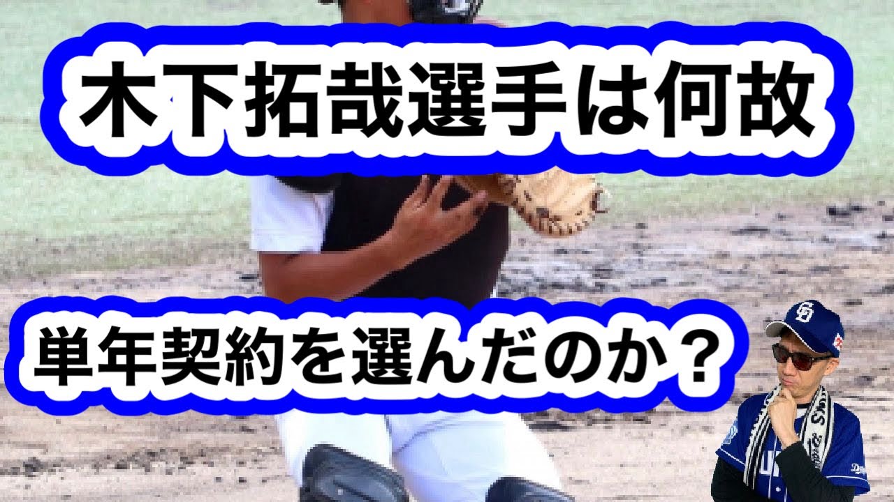 [拍手] どうも中日ドラゴンズ大好き芸人の井島 全地6ヶ月ですよろしくお願いします今日 はもうサムネにも書いてありますよね木下 タヤ選手はですねなぜ単年契約かこれをね ま素人なりに考えていこうと思いますま 単年契約に関してはですねスポーツ放置 さんにですね木の下タヤ選手のね インタビューが書いてあったのでそれを 読みたいと思います複数年だと多少の増額 があったんですが僕はあと何年やれるか わからない下したらその複数年が最後の 契約になるかもしれないと思った時に骨折 もあって2ヶ月離れたのがベースになると は後々後悔すると思う複数年という球団の せを受け取った上で単年で勝負させて くださいと伝えましたこう書いてあったん ですよねま確かにね怪我をした年の活躍が ベースになって複数年だとねどうしても 年方は安くなりますよねやっぱね野球選手 って現役の時のさ寿命って短いじゃんだ から1年でもね長く活躍したいだから複数 年契約が欲しいそして1年でもね長く活躍 してお金を欲しいですよねだからねこの 木下タヤ選手のね気持ちはねファンの 私たちは理解をしないといけませんよね そしてねま私思いますよね来シーズン木下 拓也選手はですね大活躍をすると思うん ですよねま今シーズンはね経過が多くてね ちょっと活躍ができなかったんですよね 試合も89試合にしか出場をしていません だから来はねま120試合125いや 130試合に出用して打率はまあ2割並ぶ ホームラン15本打点は60そして盗塁 阻止率は3割5分をね記録して欲しいです よねこれぐらいのね正式を残せればねまあ 4年ぐらいの複数年契約は結んでもらえる と私は思っているんですよねそしてもしも ね木下拓也選手がFAを取って多球団に 移籍これはどうしてもね阻止をしないと いけないと私は思いますよねやっぱりね キャッチャーの代りってねなかなか 見つからないんですよねキャッチャーって 1回ね正保ができてしまうとねなかなかね ま次のねレギュラーの選手をね作るまでに ねとてつもなくね時間がこれかかって しまうんですよね理由は1つやっぱりあの ポジションが1個しかないんですよねだ からまあなかなかね買がきかねポジション でもあるんですよね確かドラゴンズがです ね谷選手が引退してからね木下タヤ選手が ねレギュラーになるまで結構時間かかり ましたねその間松井斗選手やね杉山選手や なんかいろんな選手がねキャッチャーを 守ってきたんですけどもね加藤琢磨選手と