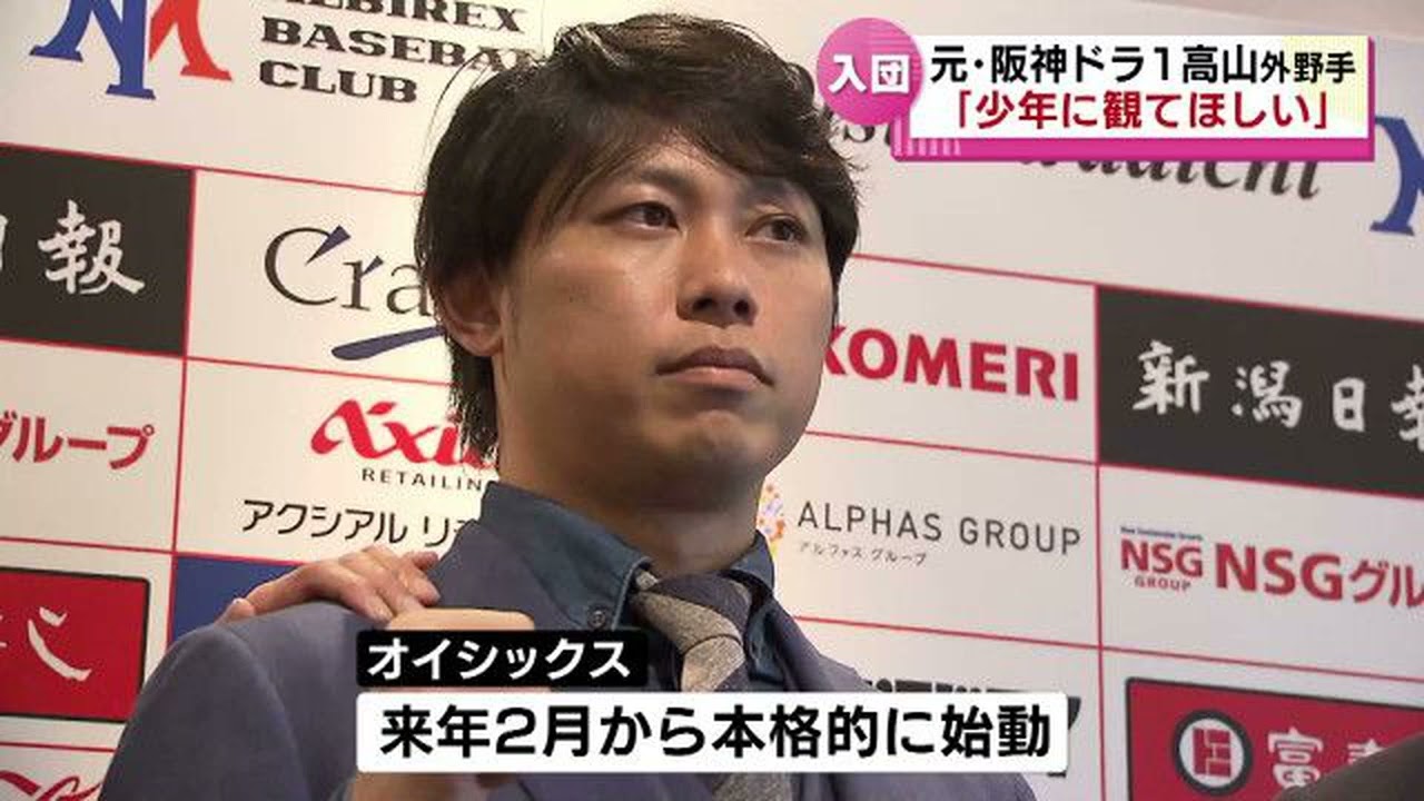 O6新潟アルビレックスBCに入団する元 阪神のドラフト1位高山春選手が18日 記者会見を開き新潟野球会への貢献を誓い ました高山春選手は明治大学出身の外野種 で2015年のドラフトで1位指名で半身 に入団しました高いバッティング技術を 持ちルーキイヤーには筆頭量産して新人王 を獲得しましたが今シーズンは1軍での手 出場はなく戦力外通告を受けました1番は NPBに復帰するというところなので来年 イースタンリーグに参戦するというので プロの選手と対戦しながら僕の実力をまた 上げていってO6の選手として戦う ファームリーグから再び1軍の世界に戻る ために高山選手は自身の活躍が新潟の野球 会の発展にもつがると意気込みまし多くの 選手がプロに入っていくというのがこの 球団にとっても1番いいことだと思う野球 少年に短かにプロ野球を見てもらい野球 選手になりたいという子が1人でも増えれ ばいいなと思いますチームは来年2月から 本格的に指導するということです