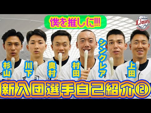 え背番号47番の杉山はき です自分はコントロールに自信があるので え右打にも左打者にもしっかり コントロールを使って投げ分けることが できますえ高校からまそのプロに入ったん ですけどままずやっっぱり1軍で登板する ということが1年目の目標です趣は音楽 聞くことが大好きです特はえ小さい頃水を やっていたので水泳が得意ですまクロール ま速さに自信があります自分は天ぷらが 好きなので天丼が大好きですあ結構食べ ます え休会を代表できるようなピッチャーと なって皆様にえ応援していただけるような ピッチャーになりたいと思うのでこれから 応援よろしくお願いし ます背番号は129番の川島正ですはい 自分のアピールポイントはストレートの 回転数が自分のアピールポイント です1年目の具体的な目標はまだ体が細い ので体を作りつつ急速だったり回転数だっ たり飛ばしていきたいと思ってます音楽を 聞い てそうなんか作業したりするのが味です 好きな歌手で言ったらえっとサザンオール スターズとかが結構好みです好きな食べ物 はオムライスが好きですうーん卵が とにかくふわふわで甘い卵が好きなので モライスが1番好きです絶対にファンの皆 様から頼られる投手になるので是非応援お 願いしますはいえ132番え奥村小一です はいえ足の速さや肩の強さえ身体能力が 武器 ですえまずは支配化登録されるように 頑張り ますダーツビリヤードゲームゲーム好き すサッカーゲームとあとパワープロもはい 好き です 焼肉ですタンがすごい好きではいタンが 好きですねライオンズに入ることができて とも思いますえファンの皆さんの期待に 答えれるようにえ1年目から精一杯頑張り ますので応援よろしくお願いし ます背番号99番の村田レオン ですピールポイントは超打力がビポイント で本当に果てしなく飛ぶような打球って いうのを打ちたいなと思って ますそうですねドラフト6位っていうこと なんで特に自分はうこともなく本当に のびのびと野球やりたいなと思ってんです けどその中で怪我だけはしないように1 年間ずっとこう野球をやり続けていたいと いうか1度も休むことがないように日々 過ごしていきたいなと思ってます
