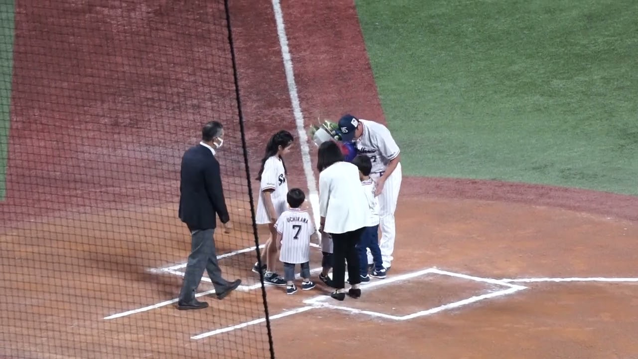 試合終了後 引退セレモニーで花束を贈呈される内川聖一選手(東京ヤクルトスワローズ)。