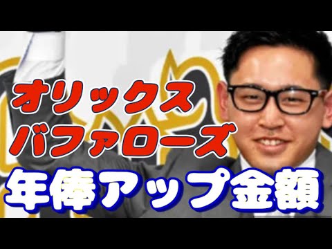 は7200まアップ4800まから大台 1億2000万円となりました22年68 試のみの出場でしたが席連続ホームラン サヨナヒットなど得点現打率3割並ぶ一輪 と勝負強さを見せました23年は96試合 の出場事故最の6ホームランを放すなど 辞退した選手の代わりではありますが 初めてオールスターにも出場しました95 年10月生まれ埼玉県出身です13年 ドラフト3位で入団10年目のシーズンを 得ました併用されていた伏見選手が移籍 するも森選手が加入83試合星レスタ面 出場し初のゴールデングラブシと3年連続 山本選手と共に最優秀バッテリー賞を受賞 しています自身もFA権を取得しましたが 9月の時点で残留を決めまし た若槻健也選手でし た第2 話8000万円アップ倍増の1億 6000万円です22年11勝23年も 10勝で防御率2.27と安定した成績を 残し3年連続規定投球会の到達と2桁勝利 を上げました2001年8月生まれ22歳 沖縄県出身の左投手です19年ドラフト1 位で入団22年に続き23年も8月月刊 MVPを受賞していますこれだけの成績を 残していますが同じポジションに山本義信 選手がいるためMVPやベスト9などが 受賞できずにいます来年こそはタイトルを そうなめと行きたいとところです21年は 新人を獲得してい ます宮城広谷選手でし たそしていよいよ第1位 はダト1位の1億9000万円アップ金額 もチームトップの 4億円22年は4月に右手の指をこせつ 102試合の出場にとまり打撃も不本位な 成績でシーズンを得ました23年FA遺跡 全球団からホームランを達成怪我でオール スターは辞退しますが自身初のさよなら ホームランなどチーム最多の18本塁だ リーグ優勝に貢献しました1995年8月 生まれ大阪府出身右投げ左打ちの保守です が外野や指名打者としての出場も多くあり ます保守部門で4度目のベスト9を受賞 19年にはリーグMVPや打者も獲得し まし [音楽] た 森友や選手でし たちなみに年方アップが決まった選手の うちアップ額12以下はこのようになって い ます最後にトップ10をもう1度振り返り ましょう11人中10人が生え抜き選手8