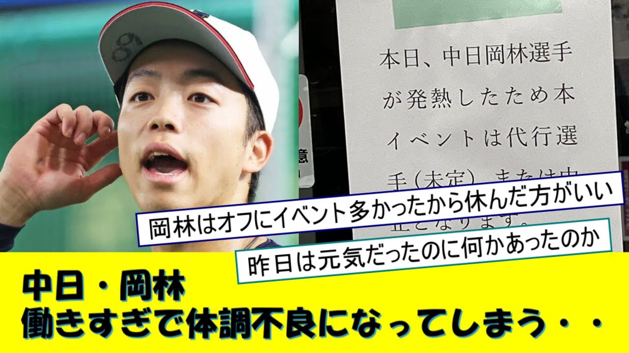 中日岡林し働き過ぎで体調不良になって しまうSNSなどの情報によると岡林は 体調不良でイベントが中止になったとの こと岡林はオフにイベント多かったから 休んだ方がいい発熱って疲れからのもの ならまだマシだがインフルエンザだったら 当分動けなくなるぞ病院でインフルエンザ もらっちゃうことあるからね良い休業に なるわ林 マジか断ることも覚えような柳の話だが CBCラジオのスポンサー向けのトーク ショなんてのもあったらしいし表に出てこ ないやつも含めると多忙を極めているよね ファンサなんて二の次でいいのに なオフって選手が成長するために めちゃくちゃ重要な期間なのにイベントで まくりでめっちゃ足引っ張られてる 球団が管理しろよこういうのは怪我からの 発熱ではなく普通に拾うからと思うよ理由 は何でもいいから今年はもう全部断って 休みにし て