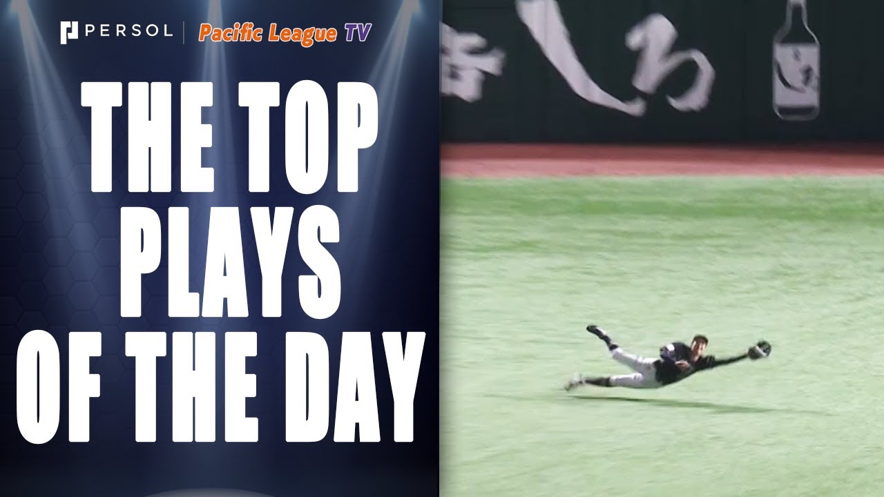 Kodai Sano of the Orix Buffaloes ends up having to stretch and dive to grab a liner to center field to end the eighth inning on July 12 against the Fukuoka SoftBank Hawks in a 4-2 victory at Fukuoka PayPay Dome. Sano sticks with a tricky liner to help the Buffaloes take the opener of a three-game set.