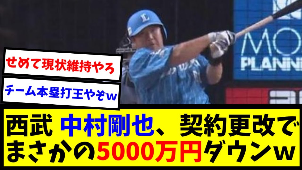 [音楽] 西武中村た5000万元の1.5億円で 公開5000万円ダウンの推定 1億5000万円で公開今年ホームランを 17本打ったがもっと打てたやはり通算 500本打ちたいGMからは来年20本次 の年9本と言われたが来年30本打つ つもり僕自身優勝したいしいい成績を残し たい来年こそはそういう1年にしたい ライオンズナイター公式 よりお代わり法なんか割とよやってると 思ったけど な40にしては十分すぎる活躍やった やろ2回の離脱があったし守備機会も なかったからしゃあ ない下がるのは予想通りやったが 5000万ダウンは意外やな西武の査定は 打席数とイニング数をかなり重視し てる本人も言ってるが年間80試合程度の 出場なら残党 よ80試合で17本これは未来の本類王 候補や なこいつが今期のチーム本類王という事実 点を取られたら取り返す山賊打線返して 40のおっさんやのに全てを託されてた からな山川はお代わりに一生頭が上がらん やろ多球団なら現状維持でもおかしくない 成績なのにそれをすんなり受け入れてるの がさすがやわ謙虚で潔良い選手や でだからこそここまでやれとるんやろ来は 万全の状態で望んでもらいたい でそりゃ下がるでしょこの言葉にお代わり らしさが詰まっとるよな本人が来もやる気 なのがよな理論的で技工花だしやから目の 衰えさえ来なきゃまだまだ やれる中村ってイメージで損しとるような 類がうまいのも知られとらん し今期も故障がなきゃ30本は達成してた はずや単年契約で球団側もまだまだ期待し てるのがいいね40歳でこんなに威圧感を 放てる打者はいねえ よご視聴ありがとうございました他にも 野球に関する面白いニュースを速報形式で 紹介していきますのでぜひチャンネル登録 よろしくお願いし ます