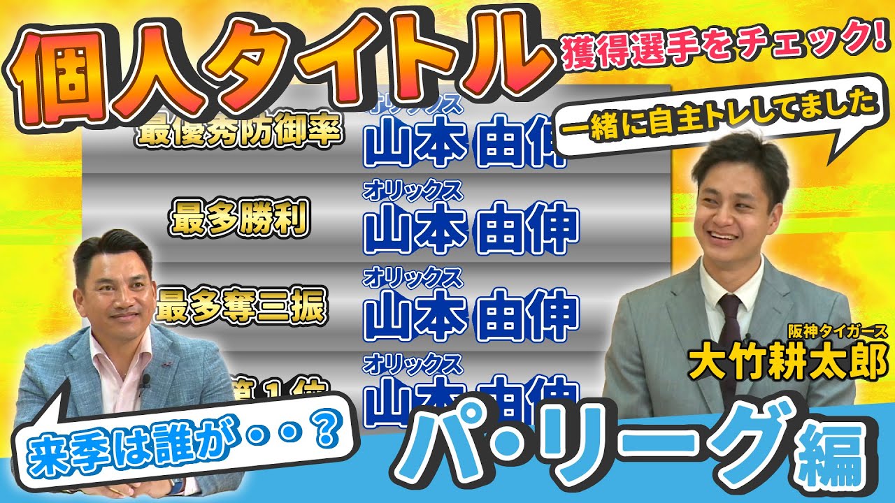 さあでは続いてパリーグの個人タイトル 振り返りますこちらですまず投手部門です が最優秀防御率山本吉信ままこれはもう 言うまでもなくあの4巻ですはいそして 最多西武が松井佑紀投手最優秀中継がペル ド投手という風になりましたがどう でしょう井口さんはいこうどうですかこの タイトルいやもうやすごいそう鍋ですよね ま逆に今年とよりは来年ここのタイトルに 誰が入ってそちょっと楽みはいの1つでは ありますよねそうですねみんなにチャンス が生まれるかね松之投手もメジャーになっ てるのでま5部門は明らかに変わるよて いうところなのでであのペルト投手もこ どうなるのかっていうはそうねまだ契約に 至ってないですそそま決まってないかはい まもいいい結果出してますんでねまより いい契約を取ろうとねあの11月1ぱでは こう契約できなかったねロテは絶対残って ほしいねベル残ってほしいですよ去年も オスとしがね行っちゃったりていうのが あるのでそうだこれベルドもは貴重だよね トにとってはちょっと大きいですね大竹 投手は山本投手のピッチンググっていうの はこうま去年までは同じリーグで戦って ましたがこうどう見られてますかはい僕 あの一緒にジシトレを2年ぐらいやらして もらったんですけどなんでキャッチボール とかもさしてもらってはいはい本当にあの 気い抜いたら顔に当たるんじゃないかって いうような入れるキャッチボールをするん ではいはいもうその僕も取ったことあるん でへえま打席でも想像つくんですけどへま やっぱりどの吸収でも勝負玉にでき るっていうのがま僕にはないのでうんそれ はやっぱすごいなと思いますねへえそれ ジシトレはどういうきっかけで一緒に行か れたんですかあま行ってるその教えて くださる先生が同じというかそういう 巡り合わせではいあそうなんです大竹選手 意外と吸収したがるんだねいろんなとこで こう情報を得てなんかこう自分のあれに なんないかっていうとこで色々やってます いろんな究すごいいろんな研究をするんだ ねそうですねえバッターはそうなかなかで も誰かのでCDとかよくてはあのね ちょっとあるかなありますでもねなんか やっぱ指導ピッチャーで自分指導じゃない ですかだから投げ方とかって結構参考なん だけどバッターって相手のピッチャーに 合わせるから意外といい部分とそうじゃ ない部分となんか難しいよね教えるのも そうだしねうんえ井口さん誰かを参考にし たとかそういうのっていうのはいやもう いろんな人から聞きましたよ参考にという