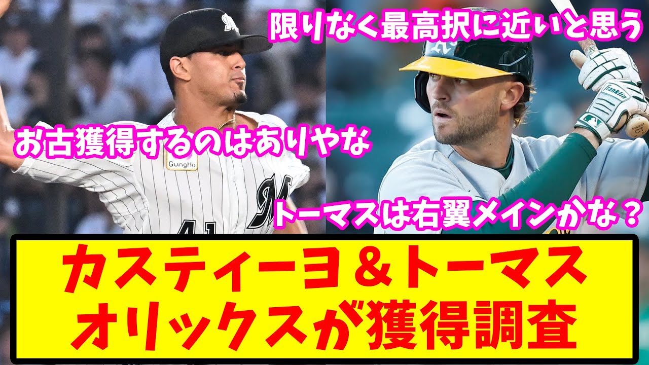 打撃面は辛い感じ今期3Aの三振率に改善 の兆しがある点が本物ならなんとかという ところだけど守れるって部分にかなり比重 を置いた選出な気がするもしかしたら打撃 特化みたいなや別に狙ってるかも野口茶の 池田トーマスの神義なき戦いが見れて しまうのかトマとトーマスが侵入団で加入 するのね守備型でミートがどう見ても あんまりなんよななんかこううまいこと何 ねかなかこ適当やっぱりスペイン語剣の 選手多いなもし取れたらトーマス以外全員 スペイン語話せるやろ正直カスティヨも 微妙なところだな戦中70点レベルって マチドの獲得糸と被る気がするんだけど とにかくリスク追ってない感じがするわ フロア型でチーム組むのは好みなんだけど あまりにシーリング低いような天井高い 先発なんて史上に出回ってないしなどうせ 表ロ急なんてトレンのや下にから裏ロテと 考えればいい補強だと思うけどスケット 外国人に対して一昔前の主力としての立ち 位置では考えてないやろね穴外国人みたい な感じカスティオってなんで自由契約なっ たん不明首にしたというより保有名簿公開 時までに契約がまとまらなくてそのままと いう印象ロッテが先に新外国人発表してる から12月頭ぐらいには互いに破断してた 感じやろな吉信があそこまで後頭したのは 本人の実力もあるけど史上に先発がいない からかとの育成投資とらんかなとは思っ てるカスティよ請求お化けだしフェッに 振られて誰か取れって中では限りなく最高 卓に近いと思うんだがこれでもケチがつく のかかっこ困惑うしても正隆吉信マネの 90億どこ行ってんって話にはなるからな 上と金の使い道って戦士補強だけじゃない しなむしろ安易に使い切らんでくれとすら 思うカスティヨはスペ技枠があるのが気に なるところカスティーヨは久々に願より ポジが勝つ戦士かもしれない吉信抜けた せや何億も使って外国人補強屋の方が怖い なとは感じる和ゲスに変わる指標芸人かこ 先発獲得や頼むから100イニング投げて くださいまあ100は正直見込めないと 思うけど70くらいは誰でもいいんだ誰か 外国人頼む100イニング実際獲得がどう なるかは不明ではありますがライキ オリックスのメンバーとして活躍して くれるなら心強いですよねこのチャンネル ではオリックスバファローズに関する ネット上の反応を動画にまとめています 是非チャンネル登録よろしくお願いします