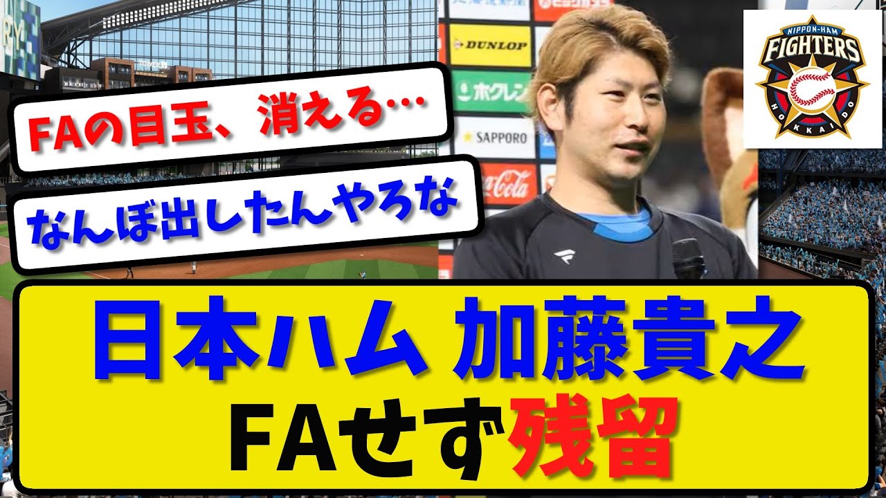 [音楽] 日本ハム加藤孝幸FAせず残留今期国内 FA県を取得した日本ハム加藤孝幸投手 31が権利を行使せず残留することが わかった近日中に会見を行い表明するFA 宣言すれば水面下で同行を中止してきた 球団が獲得に乗り出すことが確実だったが 球団側が複数年の大型契約を提示育てて もらったし残ることが本当に1番だと思っ ていると球団への感謝を常々口にしてきた 本人も誠意に答えたあつまんねハム用やっ たやんまのハムが4回交渉するのはガチ だったんだろうなんぼ出したんやろな4億 くらいかせめて宣言して欲しかった残留し てもいいのいいの宝物に気づいたようだね サンキューかとトやろハムは大事にし なきゃだなすぐポスティングしたいだの いるやつばかりなのに出そうな感じあった けど残念なんかまあタロッてが地元のりを 行かせなかったかFAの目玉消える山崎立 特資金に回るのか加藤はってと思ってた けど残ったのね本物の宝物だわというか 本人は別に遺跡なんかほとんど言って なかったよなアがロッテだのおりだの言っ てただけで戦力金庫を考えてもこれで ええご視聴ありがとうございました話題の 野球情報をお届けしていますので チャンネル登録をよろしくお願いし [音楽] ます X