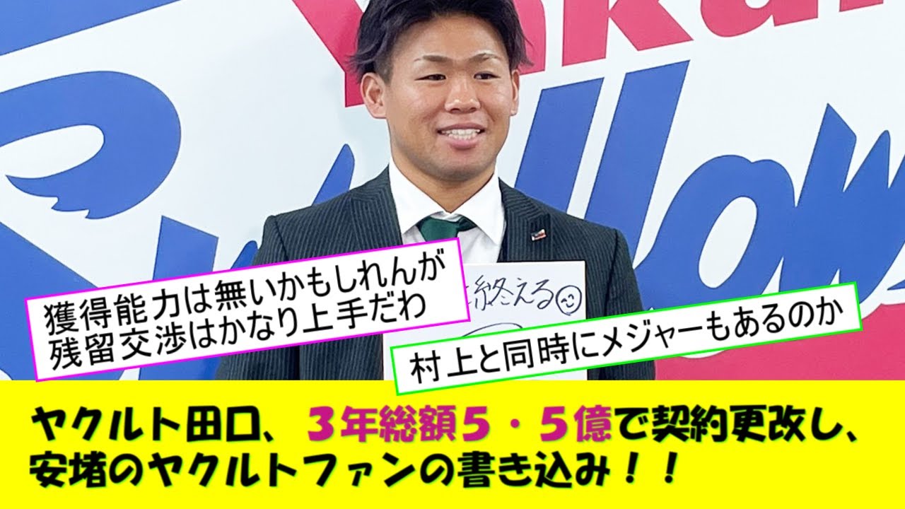 ヤクルト田口3年総額5.5億で契約公開 しアンドのヤクルトファンの 書き込みメジャー挑戦を視野に入れた慰霊 の複数年契約だヤクルトの田口和投手は 26日東京都内の球団事務所で契約交渉し 出来高を含む3年総額5億5000万円で 公開契約期間内に海外フリーエージェント 券を取得した場合に最交渉することで合意 した田口よく残ってくれたなうちは獲得 能力はかもしれんが残留交渉はかなり上手 だわ村上と同時にメジャーもあるのか来年 も結果出したら挑戦するかもなしかし来年 もいるのは安心いる間に抑えを探さない と25歳ルール変更と田口への海外からの オファー次第で来年は村上田口両方いなく なる可能性ありしかも来年は小川中村オ 石山と複数年契約切れが多数相当忙しい オフに なるまた田口はは夢だったのが大きな目標 にまで近づいたと話しておりメジャーに 挑戦したいという意志も球団に伝達順調に 行けば来中に海外FA権を取得することも あり1年ごとに話し合いの場を設けること も契約に盛り込んだだっ て田口も憧れるのをやめたの か来年優勝したいな村上田口がいなくなる 前に村上田口いなくなるとまた1から チームを作らない とDET