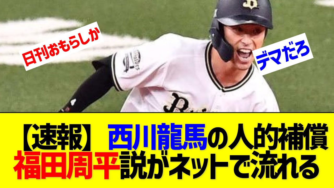 速報西川馬の人的保証福田州平がネットで 流れる広島がFA遺跡した西川馬外野29 の人的保証としてオリックスの福田周平 外野31を獲得することが4日分かったで まとかいう説もあるけど決まってから 騒ごうよ日韓がお漏らししたけどすぐ消え たらしい正人らしいな福田か福田だとする と広島はセカンドで使わんだろうし左の方 の弱い外野種で2歳年齢食って超打力皆無 にした感じになるのかそうが暑すぎて さすが上昇球団って感じだわ福田とかよそ だったらスタメン確定の選手なのにオリ ファンがちはMLBでも優勝争いでき るって言ってたけどあがち間違でもなさ そうご視聴ありがとうございますプロ野球 の父ネタとを紹介しています面白い話題が あったらコメントで教えていただけますと 嬉しいですよろしければチャンネル登録高 評価よろしくお願いしますY