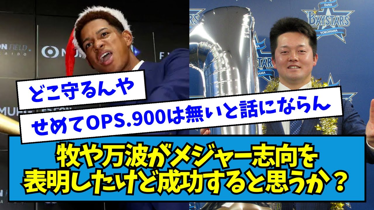 牧や万波がメジャー思考を表明したけど 成功すると思うか日本ハムの万波中世外野 種が25日将来的なメジャー挑戦の希望を 初めて大の場で明かしたドジャースと10 年総額7億ドルで契約した大谷に触れ僕も そういうところを目指したいと名言した お前らどう思うちなま29329本OPS 86756.6マハ26525本OPS 78855.2巻みたいな球場に恵まれた 成績のちびはダメだろ薪はどうしても突合 がちらつくせめてOPS900はないと話 にならん薪はメジャーでどこ守るんや まさかセカンドはないよなちなみに メジャー遺跡前年鈴木星矢が31838本 OPS107259.6打てすぎてOPS と棒のイメージが一致してない鈴木吉田は せやなって感じなのにバッターがいい契約 トレんだろ日本メジャーでOPSが200 から300下がって棒が6から7下がると 考えるとママン並のメジャー挑戦は なかなか厳しいマをファーストえってみる けどマサード9ファーストの方が良くねて 思ってるマは行くだろうなまなみも メジャー行きたいんか