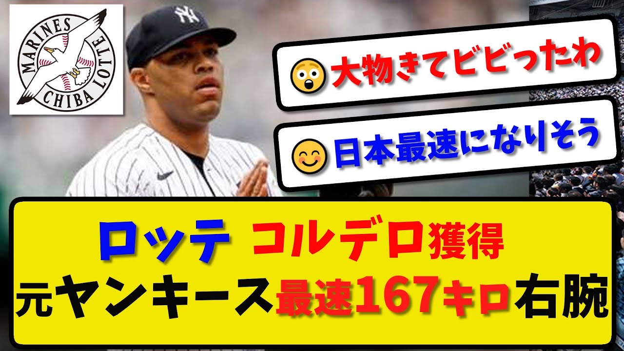 [音楽] ロッテコルデロ獲得元ヤンキース最速 167km安ロッテは日今期米代リグ ヤンキースに所属していたジミーコルデロ 投手302と契約合意したことを発表した ジミーコルデロはドミニカ出身で 190cm111kgの大型な担 ダイナミックな投球フォームから繰り出さ れる強し速急で打者をねじ伏せるこれは でけなの大物きてビビったは普通に メジャーリーガーやんらやれたら お砂と同じでDVなければ日本には絶対来 ない選手今年ヤンキースで30試合以上 投げてる普通にメジャーリーガーや1 ソフトバンクで待ってるで日本速になり そうマジかよそれならペルどもと戦闘し ないのも当然だわな合格とりあえずロッテ で使えるか見て合格したら福岡会やな ロッテこの手のやりた好きなのは分かるが ソフトバンクへの自然事業でってんの か平均160kgにきるやん1年かけて 日本に慣れさせてくれるろっての優しさよ すごいリーフだな争奪戦になったらSDが 2年に10億くらいで獲得しそうやばい ワクワクが止まらん今年30試合以上投げ てる現役メジャーリーバーって本人的にも 来年1年は必死に投げるだろうから相当 期待できるあの監督ならをさえも聞く だろうし1年格安で使えるならそれでいい よご視聴ありがとうございました話題の 野球情報をお届けしていますので チャンネル登録をよろしくお願いし [音楽] ます
