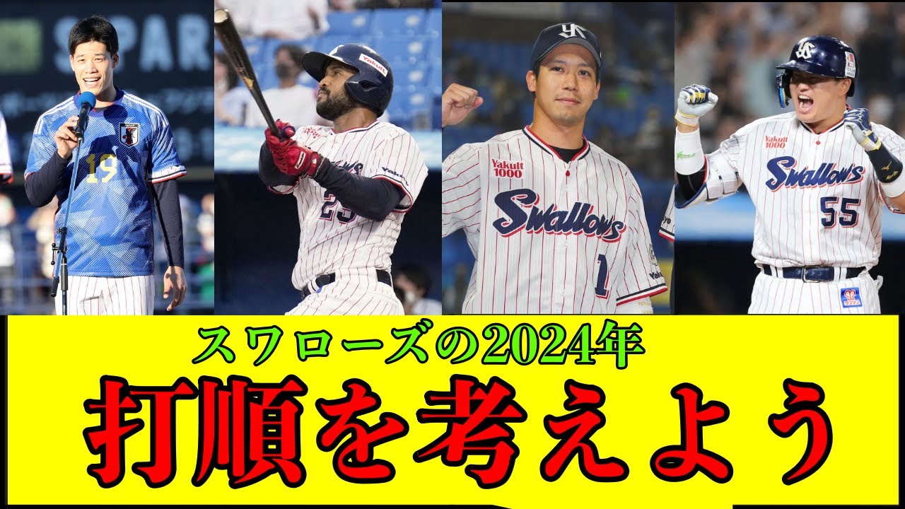 本日の動画では野手特に打順について 取り上げていきたいと思います今オフには 西川増田選手を戦力街から獲得サンタの 残留ドラフトでは高卒キャッチャーの鈴木 伊藤内野現役ドラフトでは巨人から北村巧 を獲得しました野主人については昨年と 大きく夫人は変わらずに24年シーズンに 挑むことになります昨年は者とに悩まさ れることが大であった野主人について各 ポジション本命から期待枠など個人的に 考える理想の夫人を考えました皆さんが 考える理想の打順を参考にしたいので教え ていただければと思いますまずは5 パターン個人的に考えさせてもらった打順 をご紹介しますAからEまでの5パターン 考えました皆さんどう思われるでしょうか まずAの打順についてはこまでの オーソドックスなタイプの打順であり2番 レフトを争う形を採用しました優勝した シーズンの大半をこのような形で戦ってき たので見慣れすぎて変わり映えは少ないと 思いますしもっと言うと将来に期待が持ち にくい打順なのかもしれませんここからは 山田選手がある程度バッティングの方で 成績を収めている時の打順について考え ましたBから行きましょうこの打順では レフトを争する形にし2番にサンタナを 採用しましたこの後のパターンもそうです がとにかく先制点が欲しい初回から圧を かけていきたい思いが強い打線になって いると思いますそして7番に山立鉄を置き 上位から外す形にし潮見を3番に置きまし た2と3を逆にするのも考えましたが潮見 には年間通していてもらわないといけない ですし今後のスワローズを考えると3番も ありかとかなと思い採用しました不安要素 として1番しみが相手からしても脅威で あることは間違いないため1番レフトを 任せられる選手がシーズンを通して複数の 選手が出てこなければ行けいないことが 考えられます長田が魅力の浜田や内山総面 では西川や並木と誰かが異なった時期に 調子を上げれるか高津監督ら主人が臨応変 にに ポトとなると考えましたもう1つは7番8 番の山田長岡が昨年同様に不審が続けば 打線としては機能せず穴があることになっ てしまいます23番がキーとなるそんな 打線でした次にCについてです1番に潮見 2番は変わらずサンタ3番に山田6番に レフトの争い枠を採用した打順 ですをめられるならこの打順は脅威だと 思います6番に浜田や内山機体の大砲騒い が入っても良しの打順ではないかと思い ます試合終盤にかけてダイソを出す場面