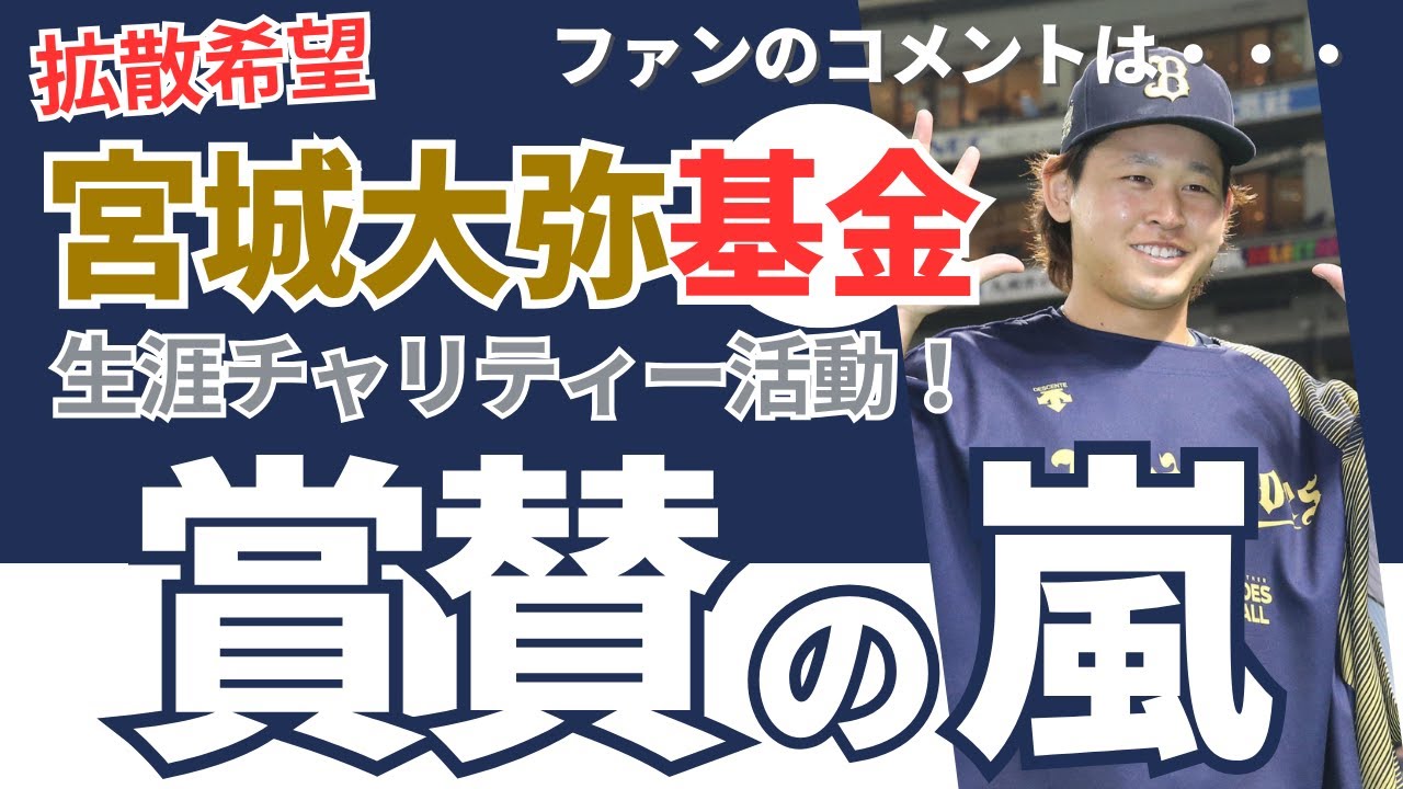 [音楽] オリックスの宮城広谷投手がグラブ造の チャリティ活動に参加し長く現役選手とし て活躍することを誓った昨年目の不自由な 方え音のデル信号機をラジオチャリティ ミュージックソンに出演しグラブを贈した ことを球団公式Xでも報告していた宮城も 宮城弘金として以前から寄付に参加今後も 続ける意向でオファーがあれば積極的に 参加したいですしできることがあればし たいなと思いますと前向きな姿勢を話した 野球会ではドジャースの大谷翔平投手が 全国の小学校にグラブを起動したことも 話題となったまだそこまでできるような 人間ではないので少しずつできればと地道 に支援を続ける覚悟を語った宮城弘金でも 反響の声が届いていると言いありがとう ございますとか少ない金額ですけど聞し ましたという方が多いもっともっと頑張ら ないといけないなと思うと励みにしている 休会では40歳を超えても現役を続ける 選手も多く何歳でも投げ続けられたら 嬉しいですし結果も出せるように頑張り たいと長期に渡っての活躍を誓った野球 選手である限りは続けていきたいですし まずは現役でしっかりやり続けることが プラスになると思いますと話基金の反響で 届く感謝の声も力に変え宮城は腕を振り 続けるファンのコメント大気5年目の若者 がこの活動ってすごすぎる子供の頃に貧乏 で苦労したからなのかもしれないけど いくら高級取りになったとはいえなかなか できることではない自らの貧しかった境遇 を明らかにしその不遇な経験から決して 恵まれていない方を支援するなかなか できることじゃないちょっと年方が上がっ たら自分へのご褒美的に高級者を買う選手 より断然応援したくなる阪神ファンですが 宮城君は好きで日本シリーズ第7戦は複雑 な気持ちでした一般からも一口500円 からの小額受付をしているので試合に勝っ た時にでも言問みたなの気持ちで気軽に 振り込むと沖縄の野球進行の一助になり ます野球を通じての社会貢献活動をして いる選手に送られるゴールデンスピリット ショーという賞がありますがもっともっと 致命度が上がって良い症だと思っています 自身の故障やスランプもありがちで現役 生活が短い職業なのに根底に感謝を 持ち合わせる人間性に育てた親御様を褒め たえたいですこの若さでこの志しの高さは ほんまに頭がが下がるわ来年も頑張れ宮城 選手はマウンドに上がってもそれ以外でも 関心することばかりもっともっと宮城弘金 のことを多くの人に知ってもらいたいです