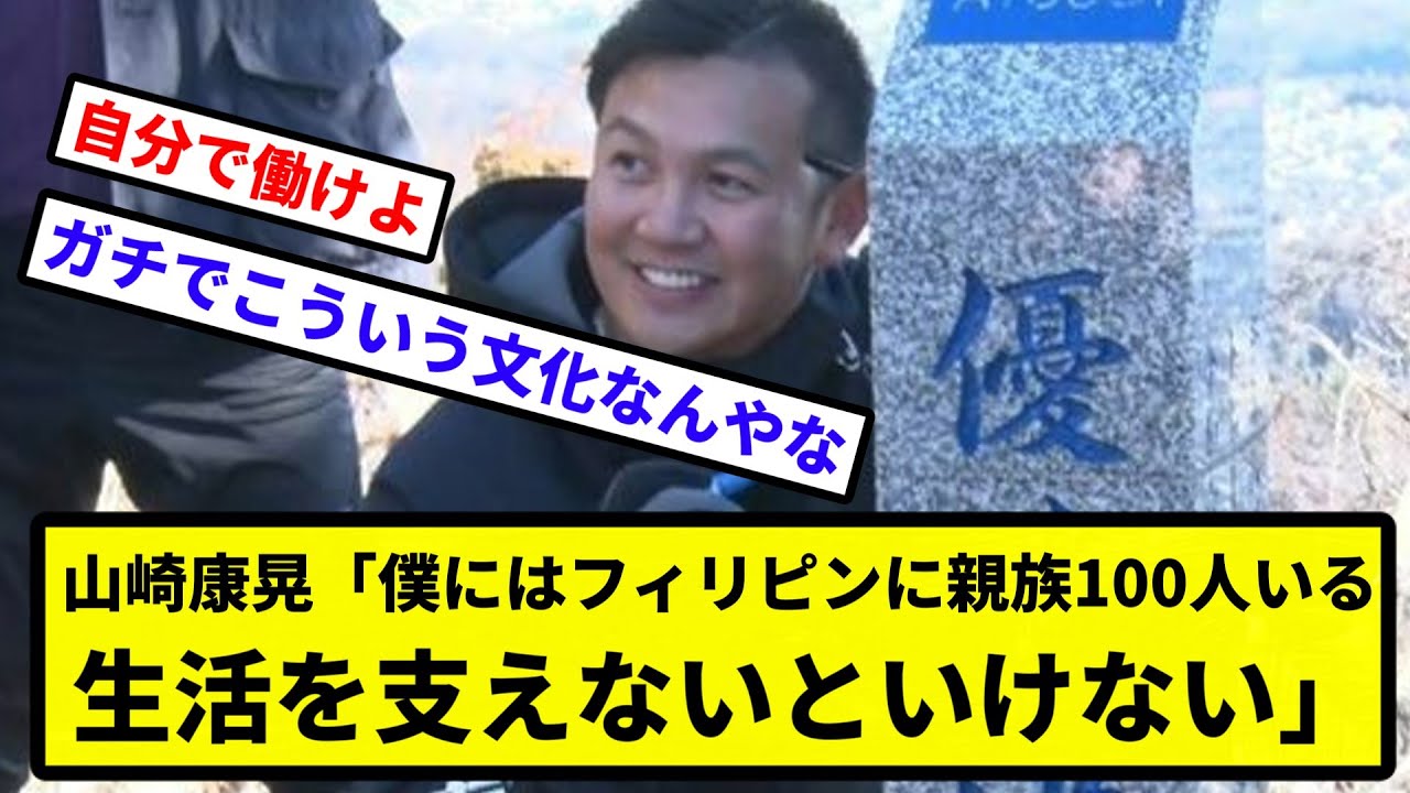山崎安明6年18億円契約中僕には フィリピンに親族100人いる生活を支え ないといけないから頑張る年末年始の 過ごし方について聞かれると何十年かぶり に母の故郷に帰ってそっちにもファミリー がいるんでまた新たな気持ちでまた1年 始まるという形となった親族だけで100 人以上いるので日本でも頑張って生活支え られるように頑張らないとと亡母メリア さんの母国フィリピンを訪れたことを 明かしました 数字に関しては僕自身も大きな目標では ありますしその先にもいろんな数字がある でも僕に今必要なことはチームの競争に 勝ち抜きことだと思うそこをまず自分の中 でクリアにしてからその上層の数字が見え てくるのかなと思う年子診断感を見据えた 山崎投手続けてシーズン序盤で絶対的守護 シンそういうポジションを確立して試合に 出てきたら誰も手がつけられない ピッチャーに成長したい土地から強く語り ました1人当たり年300万円かいや こいつに頼るのはおかしいだろWガチで こういう文化なんやなフィリピン人と結婚 したらこれがあるからいや高信国には普通 にある現象としてよく力のある人間は成功 できるようにみんなでサポートするなんや これ一体遠おかしなるでフィリピンって マジでこんな感じらしいね海外じゃ親族 から額書き集めて進学させるみたいなのも 聞くし才能あるやに全突破して見返り もらうのは文化なんやろなフィリピンは ガチであるから困るワの親戚のおじさんも フィリピンの若妻もらってからなぜか生活 の質が落ちとるフィリピン人が親戚にいる と日本期て金要求してくる霊が珍しくない フィリピン人男と買う日本で決してみない 謎の存在ご視聴ありがとうございまし [音楽] た Y