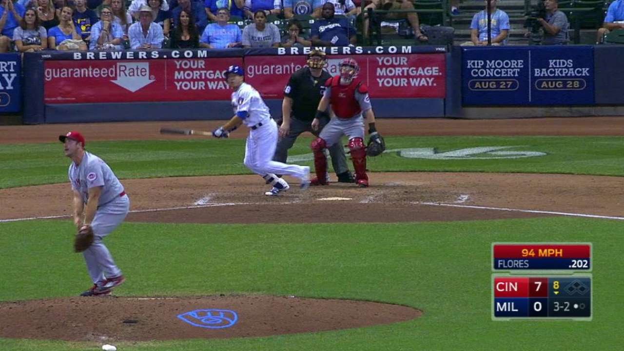 Braves look real good certainly will get another shot in there for junior guerra who’s on the d.l flores into center hit well hamilton still going back this ball is up and gone ramon flores flashing some surprising power and the brewers are finally on the board it’s a home run for flores