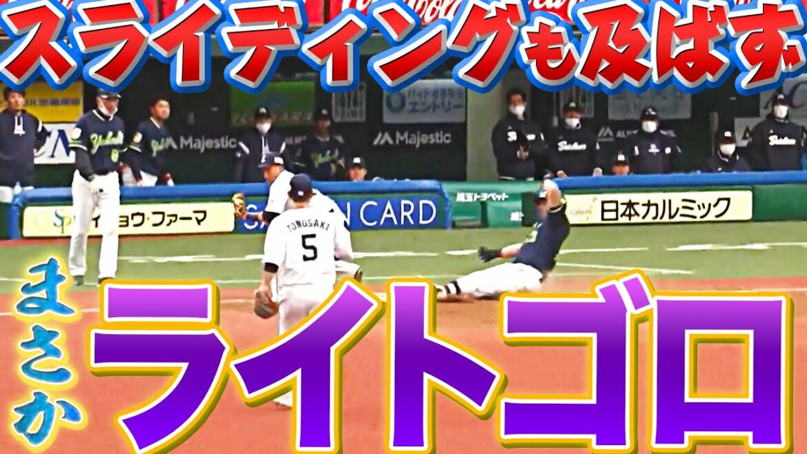 なんとも珍しい。東京ヤクルト・オスナが右前へ鋭い当たりを放ち、懸命にスライディングも埼玉西武・愛斗の送球に間に合わずアウトに!記録はライトゴロとなった。