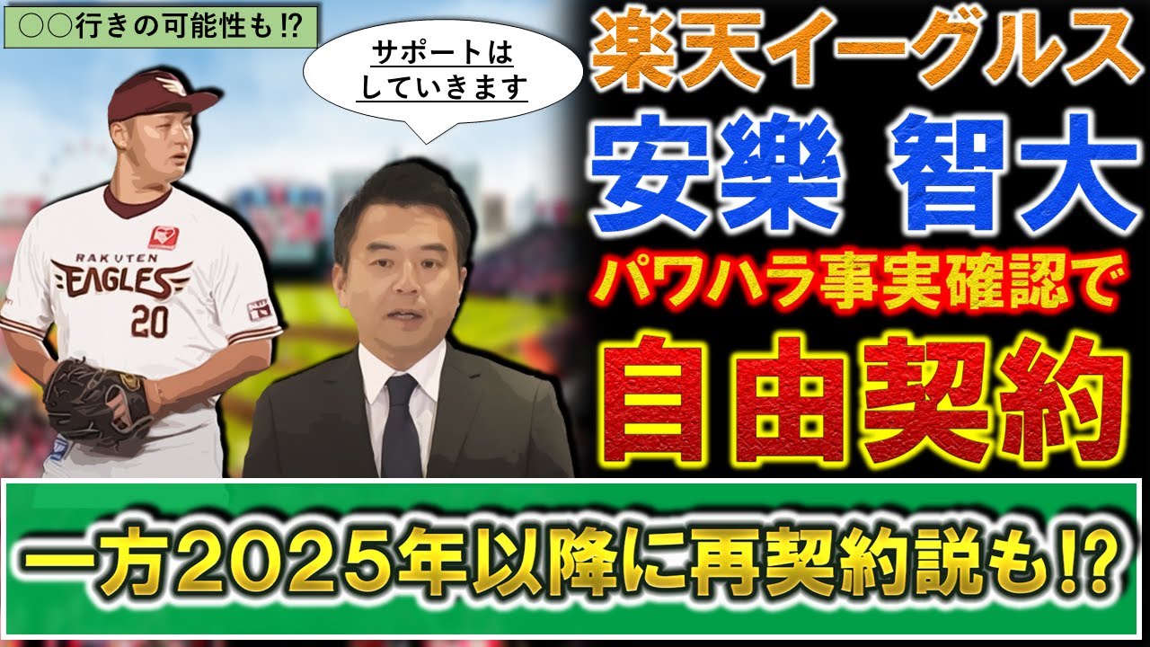 たかなという風に思いますでま調査した 結果ね10名の選手が被害を訴えて目撃も 40名っていうところでますごい数ですよ ねやっぱま団内では当たり前になっていた のかなっていう風に思いますまこれだけ見 てる人がいればねま自由契約っていう措置 は当然かなというところでございますでは ま改めて安楽選手ねどういう選手が成績で あったかっていうところもしっかりと 振り返っていき ましょうはい安楽友広選手プロ9年目出身 地は愛媛県1996年11月翌日まれ27 歳186cm87kmポジション ピッチャーで右投げ左内を選手でござい ます2014年ドラフト1石名の選手でえ 今シーズンの年方は3700ま昨年は 4000万円ということになっております 平均-146kmほど九州はスライダー カーブチェンジアップシュートボールなど を投げます甲子で活躍を見せドラフトでは 2球段競合の末楽天に入段1年目から1軍 デビューを果たすと2年目には先発として 3勝マクしかしそこからは怪我などもあり 1軍に定着できず20年から本格的に リリーフに転校するとそれがはまって 20201年にはキャリアハとなる58試 に登板し22ホールドを記録そして昨年は 防御率4点ながら52登板今シーズンも 57登板で3年連続50登板以上と リリーフとして安定感を見せていたという ことでございますはいこのアンラ選手ま備 高校出身ま甲子園でこう大活躍ねして2 球団競合ヤクルトとの競合をね楽てが 勝ち取ってプロ入りしておりました通算で 見ていくと231試で18勝21敗50 ホールド3セブ3652イニングで防具率 が3.5ダサ率6.8によ9率が3.40 とまバーとしてね花開いてまずまずの成績 っていうのを残しておりました昨年はね 52試合で6勝2敗13ホールド56.1 イニングで防具率が 4.38円連続50試以上と番こう スタッツは抜群っていうわけではないん ですがまあまあしっかりね毎年安定して 多くね登板数を重ねていたっていうところ は評価されるポイントかなっていう風には 思うんですがただそんな安楽選手パワハラ が認められて自由契約にというところに なっておりましたうんまあまあやっぱね 本当1番最初に報道があった時は びっっくりしたというかですねまあまあ その後いろんな話が出てきて厳しそうなね ところではあったんですがま今回正式に 自由契約まただ今後再契約説もねなくは ないんじゃないかみたいな話も出ており