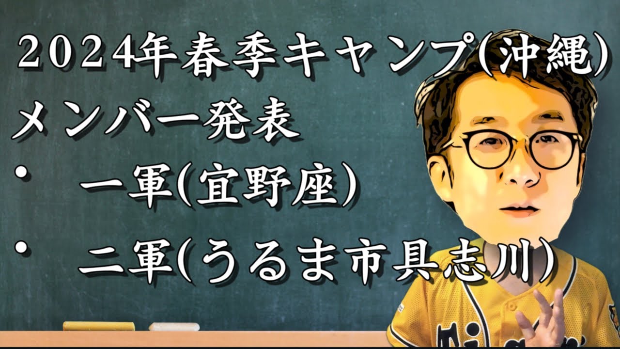[音楽] はいこんにちは大ですとこチャンネルへ ようこそはいえ2024年え春期キャンプ のメンバーが発表されましたよねはいえ この動画ではですねこの1軍メンバー2軍 メンバーそれぞれえ見ていきましてえこの 2月から始まる沖縄キャンプでえどういう 選手に注目すればいいかみたいなねえ参考 になっていけばいいなという風に思って おりますそれではあまずは当主人から見て いきたいと思いますでは行ってみ ましょう はいえ1軍2軍それぞれの党人がこちらに なりますえまずはですね1軍メンバーから 見ていきましょう総勢20名ですねえ新 スケット投手であるゲラー投手えそして西 純也西佑紀投手え青木投手にシバ投手え糸 正投手門別投手えそしてオリックスから ですね現役ドラフトでえ阪神に来ましたう 原大手でございますねえそして木手浜手え そして川手村上正木投手え霧投手え茨城 投手え大竹投手富田投手岡投手えそして岩 投手石井投手ビズ投手以上20名でござい ますねはい続いて2軍メンバー17名え見 ていきましょう岩崎す投手え岩田手え島え 下村カ投手え森木投手秋山投手鈴木投手え 島本投手え鍛冶投手に石黒投手津田投手え 岩田投手に小川投手松原投手に伊藤涼投手 え川原投手高橋ハト投手ですねえあとは 佐藤連投手という以上17名になりました はいえまこう見てみますとまずですね目に 1番に目につくところがえ高卒2年目の 門別投手と茨城投手がこう一軍に入って いるという点ではないでしょうかはいこの 高卒2年目のフレッシュな投資これ岡田 監督が見たいんだなというような図が ビンビンと感じ取れますよねえそしてもう 1点この一軍メンバー見ていくとおシバ強 投手が入っているんですよねはいシバ投手 はですねこの新人で唯一一軍に抜擢されて おりますえま体つきとか見てもですねシバ 投手なかなかいいからきしてますよねえ ドラフト1位の下村投手は逆にま2軍にえ 選ばれておりますえ下村投手なんかはね 多分ドラフト1位のプレッシャーなんかも あるのでえあまり無理させないためにまず は2軍に置いてスタートさせようという 意図なのかなという風に感じ取れますはい え高卒2年目門別投手茨城投手が抜擢され てる点ですとかえシバ投手は新人唯一の一 軍選手に選ばれたとまたですねこう見て いきますと集権の中継投手人っていうのが あま概ね2軍にいるんですよね岩崎す投手 や岩田投手えあと島本投手やカア投手です ねまもうま中堅ベテランに入ってきますの