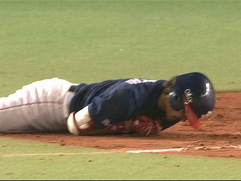 成瀬善久の変化球は抜けて坂口智隆の手首に当たる。激痛で倒れこむ坂口だが、痛みを堪えて一塁へ歩き出した。(2010年8月20日 千葉ロッテマリーンズ対オリックス・バファローズ)