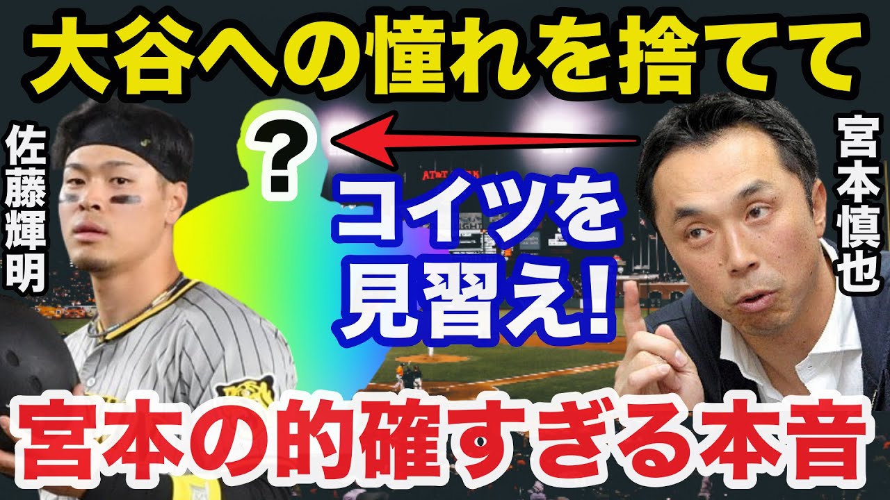 に貢献したことで佐藤のフーム論争につい ては一旦収束を見せていましたが岡田監督 が下半身を鍛えて欲しいと口にする中で 佐藤の出した結論はドライブラインでの トレーニングでしたどこか食い違いを見せ ているようですが佐藤はクリスマスに行わ れたイベント後にもシーズン中のデータを 持っていって調子のいい時と悪い時の体の 使い方動きがこうなっていると教えて もらった悪くなると股関節の動きに影響が あるみたいでいろんな要素があると分かっ たドリルももらったんでジシトレで勉強し 続けてやっていきたいとどこ吹く風といっ たそぶりを見せていますOBや評論家の誰 しもがその逸ぶりを認める佐藤ですがこの オフこそ計画な過ごし方が求められると 指摘したのは元ヤクルトの宮本深夜 です勘違いしないでほしい足元から固め ないと宮本が口にした佐藤表と は宮本は昨年佐藤が2軍落ちを経験した際 に近本も怪我したり他の選手も調子が悪く なっているけどやっぱり里てるじゃない ですか里テるがもっとしっかりしないとと 話を切り出し 目の前にものすごくいい見本がいるんです よ大山というボンダで自分の中でがっかり してても一生懸命走るしああいうのを サトテルも見習ってほしいですよね人間な ので調子いい時も悪い時も絶対あるでも 全力失踪なんて誰でもできることなんで そういうのを見習ってほしいですねと注文 をつけました宮本は佐藤のフォームについ ても結果が出ていないのに柳とかが大谷の フォームにしたってあまり意味がないです よまずは自分の持っているものを限界まで 極めてからでも遅くないはずです次から次 にフォームを変えることは賛成できません ねと苦言を呈してい ますそういった考えが背景にあるからこそ 宮本は佐藤が平凡な成績を出し続ける選手 に終わる可能性を危惧しておりシーズン中 に岡田監督が口にしたこのままでは波の 選手で終わってしまうということに対して も穴がち間違っていない発言であるとし まし た阪神時代には佐藤と同じ背番号8を 背負ってプレイした福幸介も日替わりの 佐藤のフォームについて渋い顔を見せた ことがありました福は昨年の4月佐藤が 打率1割7部五輪0本ルダ2打点と極度の 不審に陥っていた際には直接練習上を訪れ て佐藤のを確認したことがありました約1 時間の練習を終えた佐藤に対して服はまず 最初に打者にとって最も大事なタイミング が一定していないことが不審の原因と分析