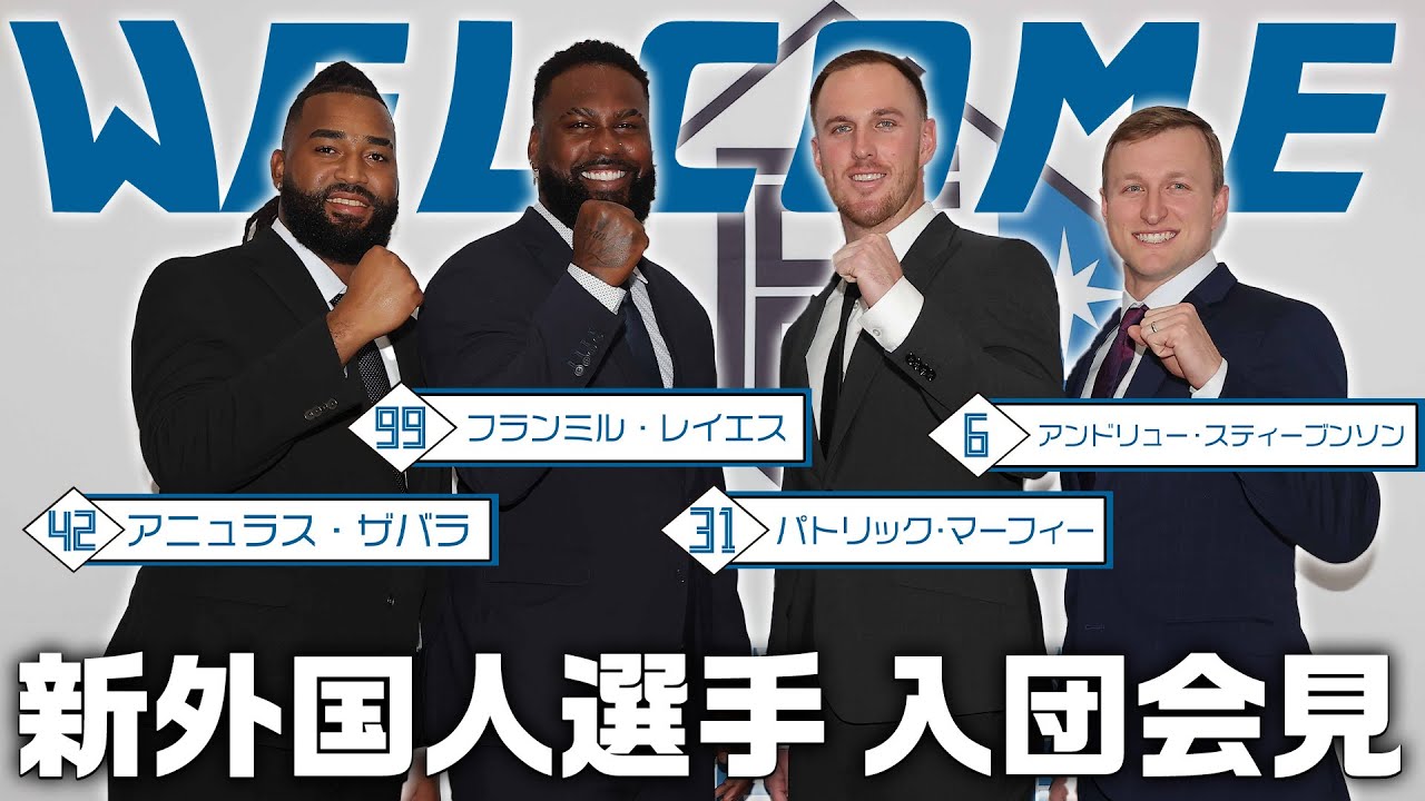 スティブンソン選手、マーフィー選手、レイエス選手、ザバラ選手が1月30日(火)、キャンプ地の沖縄県名護市内で入団会見に臨みました。キャンプでアピールしたいこと、新庄監督の印象、ファンの皆様へのメッセージなど語ってくれました!お楽しみください!