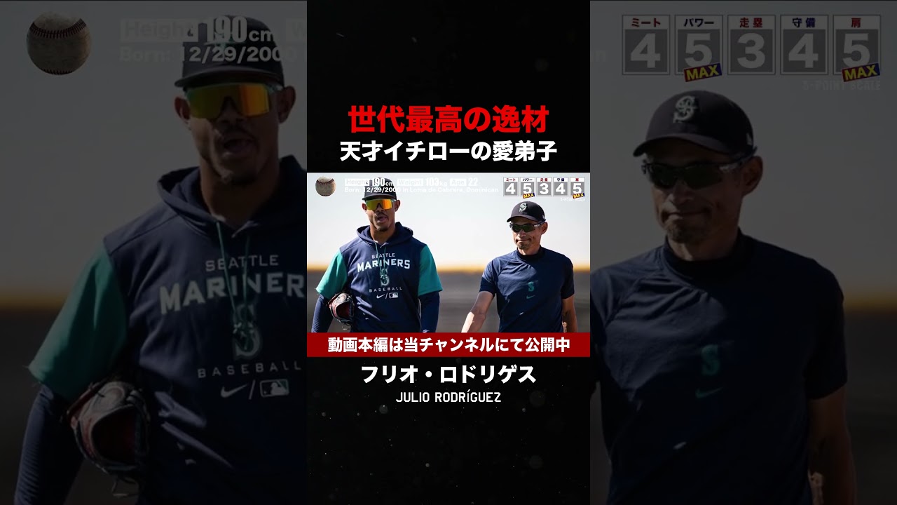 メジャーリーグでは毎年当たり前のように 怪物のような新人選手が続々と現れるが昨 シーズンその大格となったのはシアトル マリナーズに所得するクリオロドリゲスと いう選手 [拍手] だろう1とも深い関係があることで知ら れる彼は身長190cm体重103kg この圧感のある見た目空格に反まだ メジャー2年目22歳の 若者 [拍手] メジャーの舞台に上がってきた昨年は世代 最高の一と言われメジャー全体でナンバー ワンのプロスペクトと評価されマンをじし てのメジャーデビューとなっ た