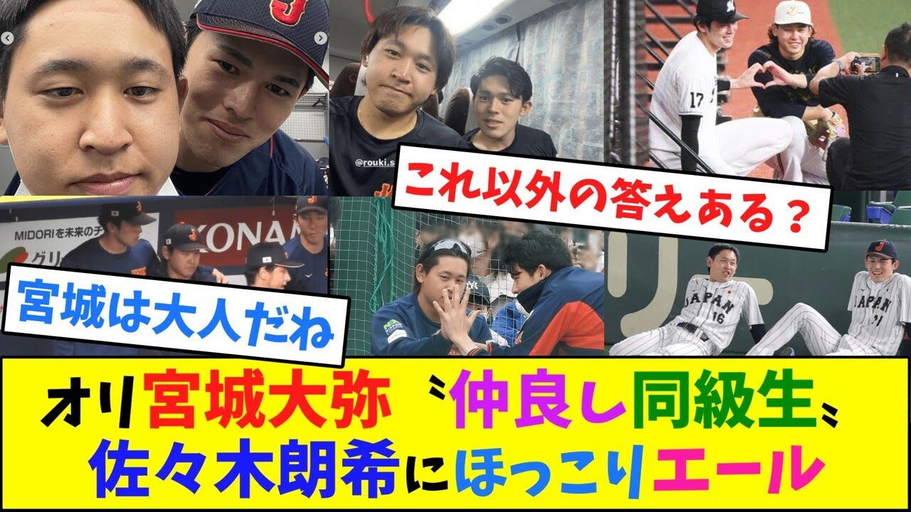 森ひや仲良し同級生佐々木ロキにほっこり エール佐々木はMLB挑戦を巡って球団と の交渉に時間を用し12球団ラストの27 日にようやく契約を公開慈悲キャンプの 可能性もあっただけにファンをきもきさせ たが親友の宮城は冷静に見ていたU18 日本代表の頃から仲が良く昨年は揃って WBCに出場試合でも対戦相手ながら練習 前に嬉しそうに話す姿が注目されロッテと オリックスのコラボグッズ宮城君とタまで 発売されて人気を白したその相方は夢と 現実の間で立ち王場しながら今期も国内で のプレイを決断そんな野球人としての佐々 を宮城はどこまでも後押しする気持ちは 変わらないポテンシャルはすごく感じます し彼だけじゃなく先輩の山本吉信さんとか これからもいっぱい向こうに行く人はいる と思うんで野球を盛り上げてほしいプロで 長くやっても20年くらい僕は彼のファン 同じ職業にはなるけど一同級性としてどの 道に進んでも普通に応援する向こうに行っ ても残っても変わらないまたご飯行きたい です2人の間ではもう少し踏み込んだ会話 があったりするかもしれませんが大の場で 他人の人生に口出しはできないし友達とし て応援したいという気持ちは本当だと思い ます今年も宮城投手老樹投手の投げ合いが 見てみたいしタイトル争いもして欲しい 多少の人生に責任は持てないですし宮城 投手は脇前とデリカシーのある大人なので 他人の重要な選択には絶対に口を出さない でしょう宮城は大人で佐々木はがなだけ こんな友達がいたら話したくなくなるの わかる気がする持つべきものは良きとも ですねご視聴ありがとうございました チャンネル登録よろしくお願いします