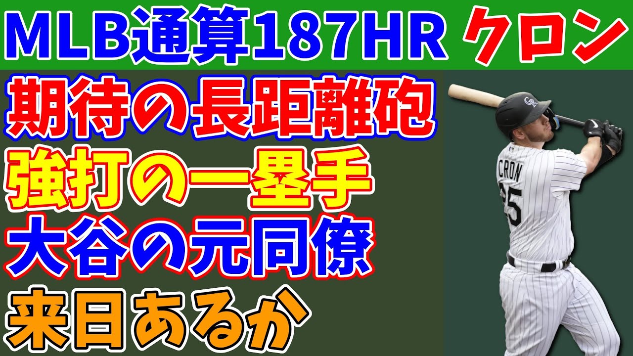 やあやあずんだもんなのだ 助っ人外国人候補紹介シリーズ ということで今回はメジャーリーグ 屈指の長距離砲c.j.クロン選手について 紹介していきたいと思うのだ 2023年はシーズン途中にエンゼル スへと加入したこともあり大谷 選手のチームメイトとして覚えて いる人もいると思うのだ 現在フリーエージェントとなっている c.j.クロン選手は助っ人外国人候補 として一部で名が挙がっている のだ mlb通算本塁打は187本と長打力は 抜きんでたものがありもし来日 すれば実力面では圧倒的 弟のケビンクロン選手がnpbに在籍 していたこともありもし来日すれば かなり面白い存在になりそうなのだ そんなc.j.クロン選手について詳しく 解説していくのだ c.j.クロン選手のプロフィール c.j.クロン選手の本名はクリストファー ジョンクロンジュニア 弟は広島カープにも所属していた ケビンクロンで親戚にも元メジャーリーガー がいるなど野球一族で育った 1990年1月5日生まれの現在34歳で 年齢的にはベテランと言っても いい 右投げ右打ちの一塁手で完全に 一塁専門の選手 高校時代にドラフト44巡目で指名 されたもののユタ大学へと進学 アメリカ大学球界で無双したこと で評価が急上昇し2011年にドラフト 1巡目でエンゼルスから指名された 勢いそのままにマイナーリーグ でも無双を続け素晴らしいスピード でキャリアを重ねた 2014年には早くもメジャーデビュー するとわずか253打席で11本塁打 を放ちメジャーリーグでも活躍 その後はエンゼルスの一塁に定着 したが3年連続16本塁打と少々物 足りない成績であったことは事実 2018年にはレイズへとトレードされる こととなったがここで一気に長 打力が覚醒し30本塁打を記録 2019年にはツインズへと移籍した がここでも25本塁打を放って長 打力をアピール 2021年からはコロラドロッキーズ へと移籍打者天国として知られる